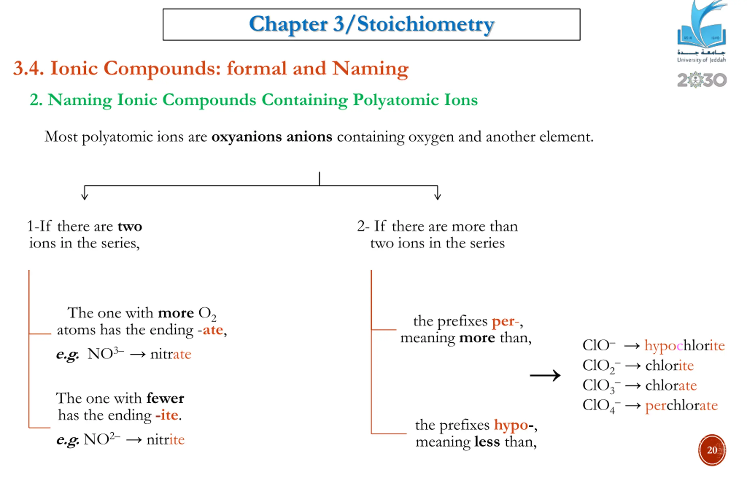 Chapter 3/Stoichiometry 3.4. Ionic Compounds: formal and Naming 2. Naming Ionic Compounds Containing Polyatomic Ions Most polyatomic ions are oxyanions anions containing oxygen and another element. 1-If there are two ions in the series, 2- If there are more than two ions in the series The one with more O2 atoms has the ending -ate, e.g. NO3 nitrate the prefixes per-, meaning more than, ClO hypochlorite ClO2 chlorite ClO3 chlorate ClO4 perchlorate The one with fewer has the ending -ite. e.g. NO2 nitrite the prefixes hypo-, meaning less than, 20