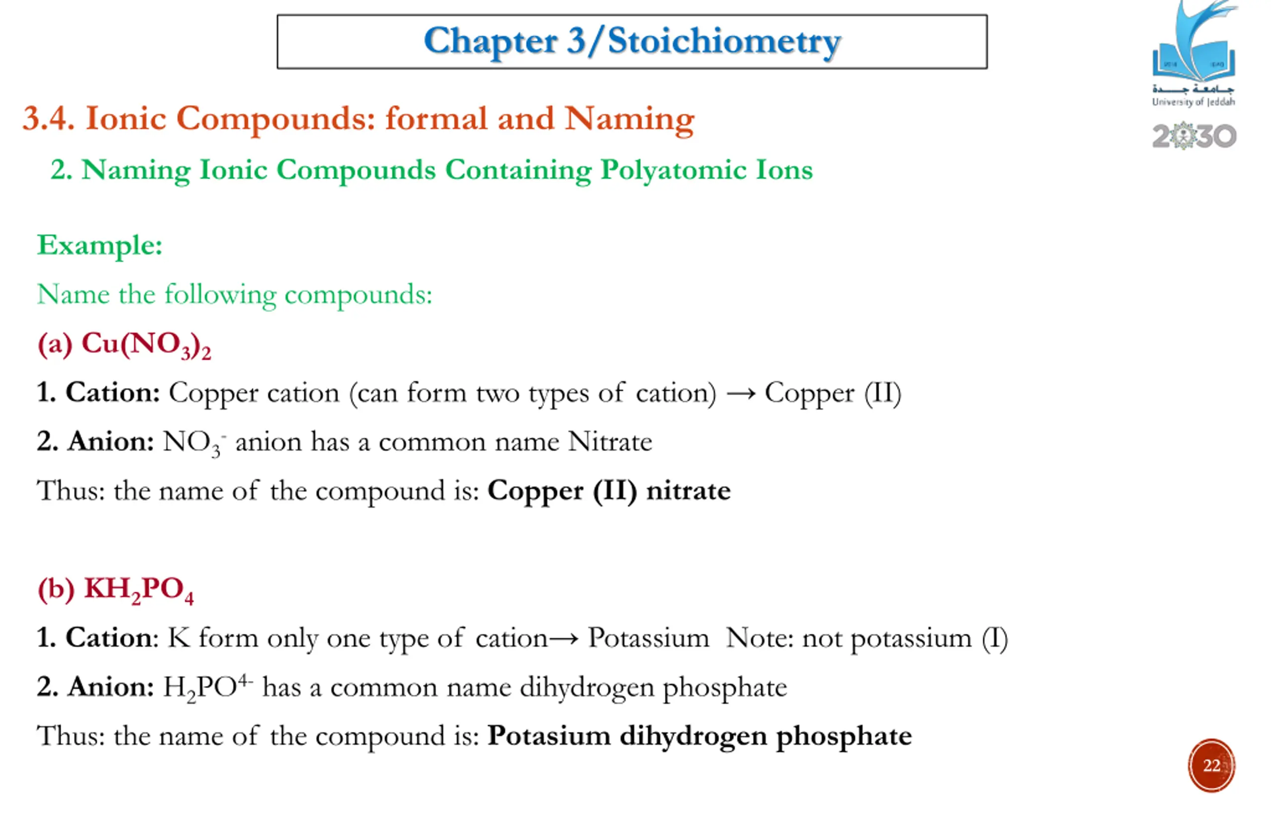 Chapter 3/Stoichiometry 3.4. Ionic Compounds: formal and Naming 2. Naming Ionic Compounds Containing Polyatomic Ions Example: Name the following compounds: (a) Cu(NO3)2 1. Cation: Copper cation (can form two types of cation) Copper (II) 2. Anion: NO3- anion has a common name Nitrate Thus: the name of the compound is: Copper (II) nitrate (b) KH2PO4 1. Cation: K form only one type of cation Potassium Note: not potassium (I) 2. Anion: H2PO4- has a common name dihydrogen phosphate Thus: the name of the compound is: Potasium dihydrogen phosphate 22