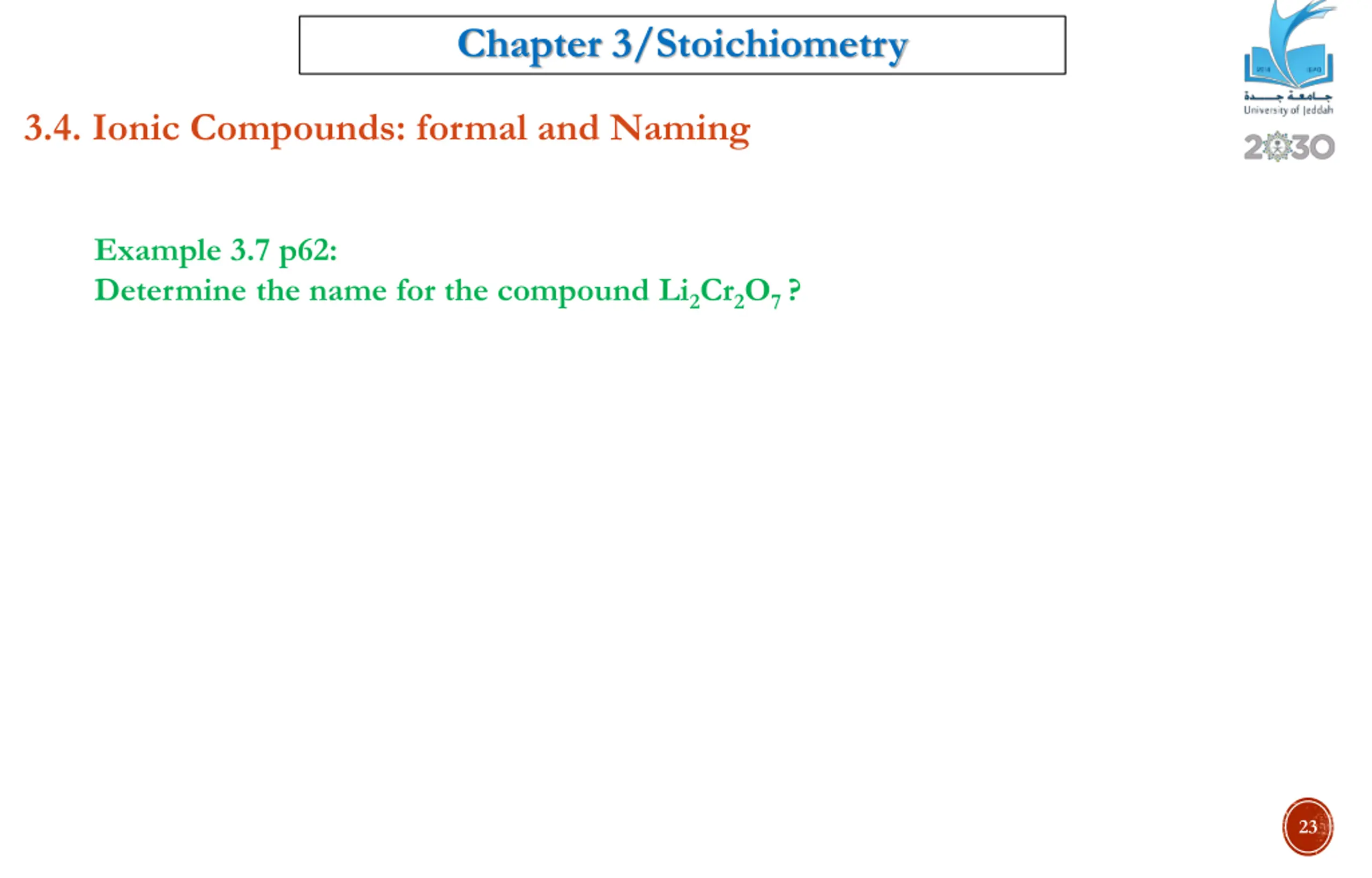 Chapter 3/Stoichiometry 3.4. Ionic Compounds: formal and Naming Example 3.7 p62: Determine the name for the compound Li2Cr2O7 ? 23