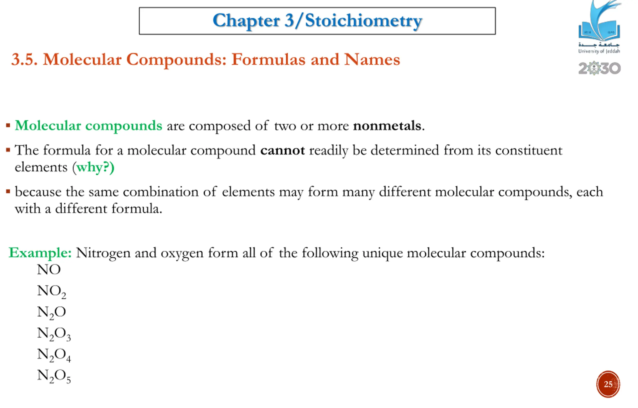 Chapter 3/Stoichiometry 3.5. Molecular Compounds: Formulas and Names Molecular compounds are composed of two or more nonmetals. The formula for a molecular compound cannot readily be determined from its constituent elements (why?) because the same combination of elements may form many different molecular compounds, each with a different formula. Example: Nitrogen and oxygen form all of the following unique molecular compounds: NO NO2 N2O N2O3 N2O4 N2O5 25