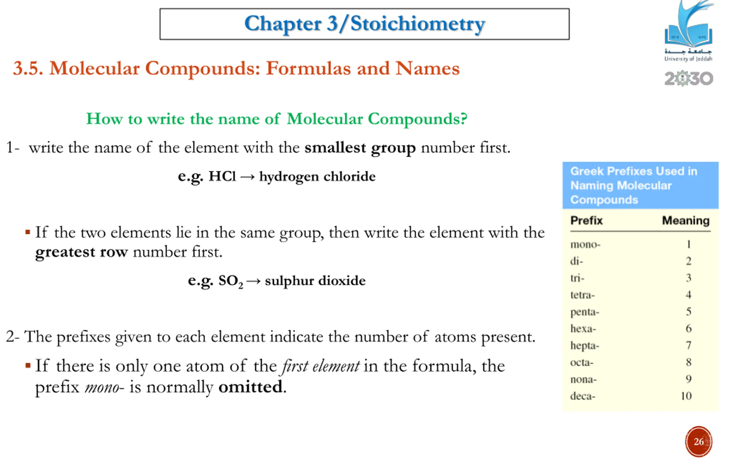 Chapter 3/Stoichiometry 3.5. Molecular Compounds: Formulas and Names How to write the name of Molecular Compounds? 1- write the name of the element with the smallest group number first. e.g. HCl hydrogen chloride If the two elements lie in the same group, then write the element with the greatest row number first. e.g. SO2 sulphur dioxide 2- The prefixes given to each element indicate the number of atoms present. If there is only one atom of the first element in the formula, the prefix mono- is normally omitted. 26