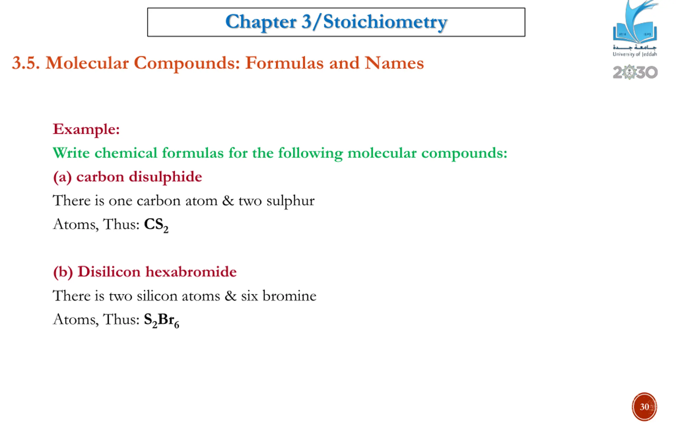 Chapter 3/Stoichiometry 3.5. Molecular Compounds: Formulas and Names Example: Write chemical formulas for the following molecular compounds: (a) carbon disulphide There is one carbon atom & two sulphur Atoms, Thus: CS2 (b) Disilicon hexabromide There is two silicon atoms & six bromine Atoms, Thus: S2Br6 30
