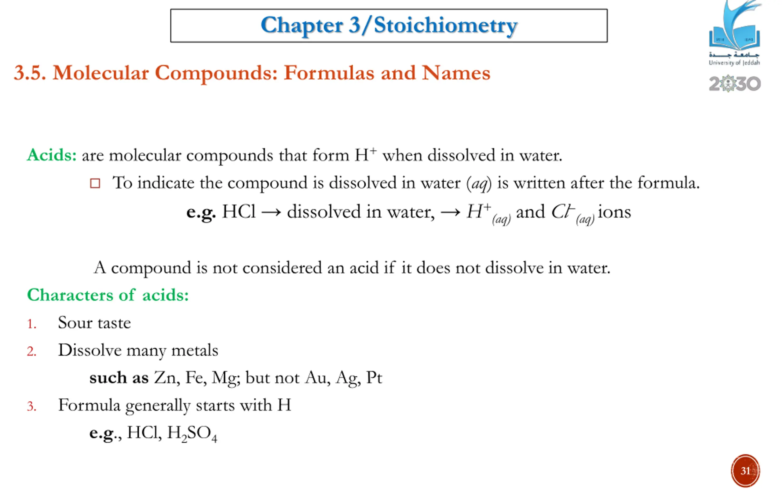 Chapter 3/Stoichiometry 3.5. Molecular Compounds: Formulas and Names Acids: are molecular compounds that form H+ when dissolved in water. To indicate the compound is dissolved in water (aq) is written after the formula. e.g. HCl dissolved in water, H+(aq)and Cl (aq) ions A compound is not considered an acid if it does not dissolve in water. Characters of acids: Sour taste Dissolve many metals such as Zn, Fe, Mg; but not Au, Ag, Pt Formula generally starts with H e.g., HCl, H2SO4 1. 2. 3. 31