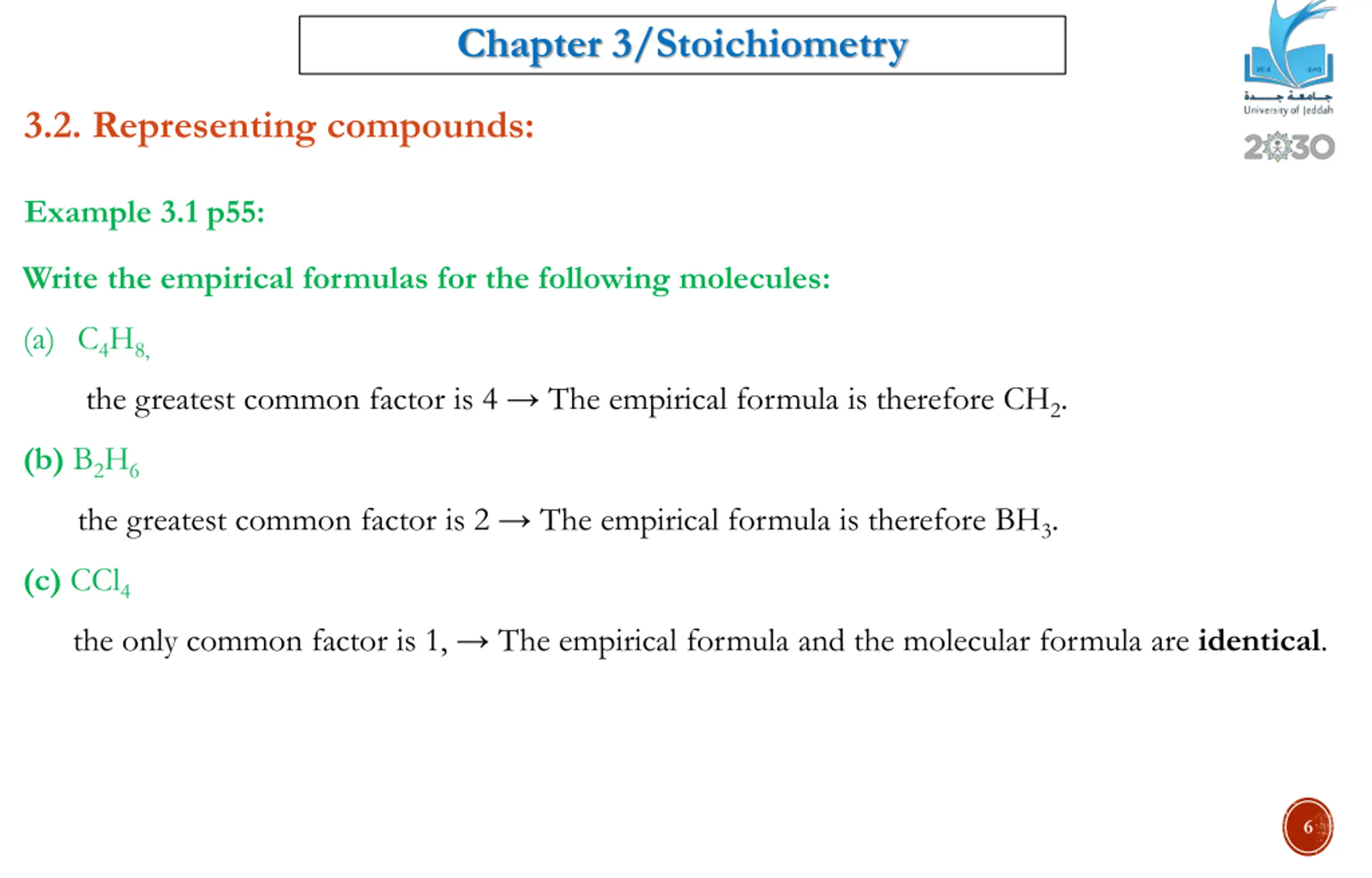Chapter 3/Stoichiometry 3.2. Representing compounds: Example 3.1 p55: Write the empirical formulas for the following molecules: (a) C4H8, the greatest common factor is 4 The empirical formula is therefore CH2. (b) B2H6 the greatest common factor is 2 The empirical formula is therefore BH3. (c) CCl4 the only common factor is 1, The empirical formula and the molecular formula are identical. 6