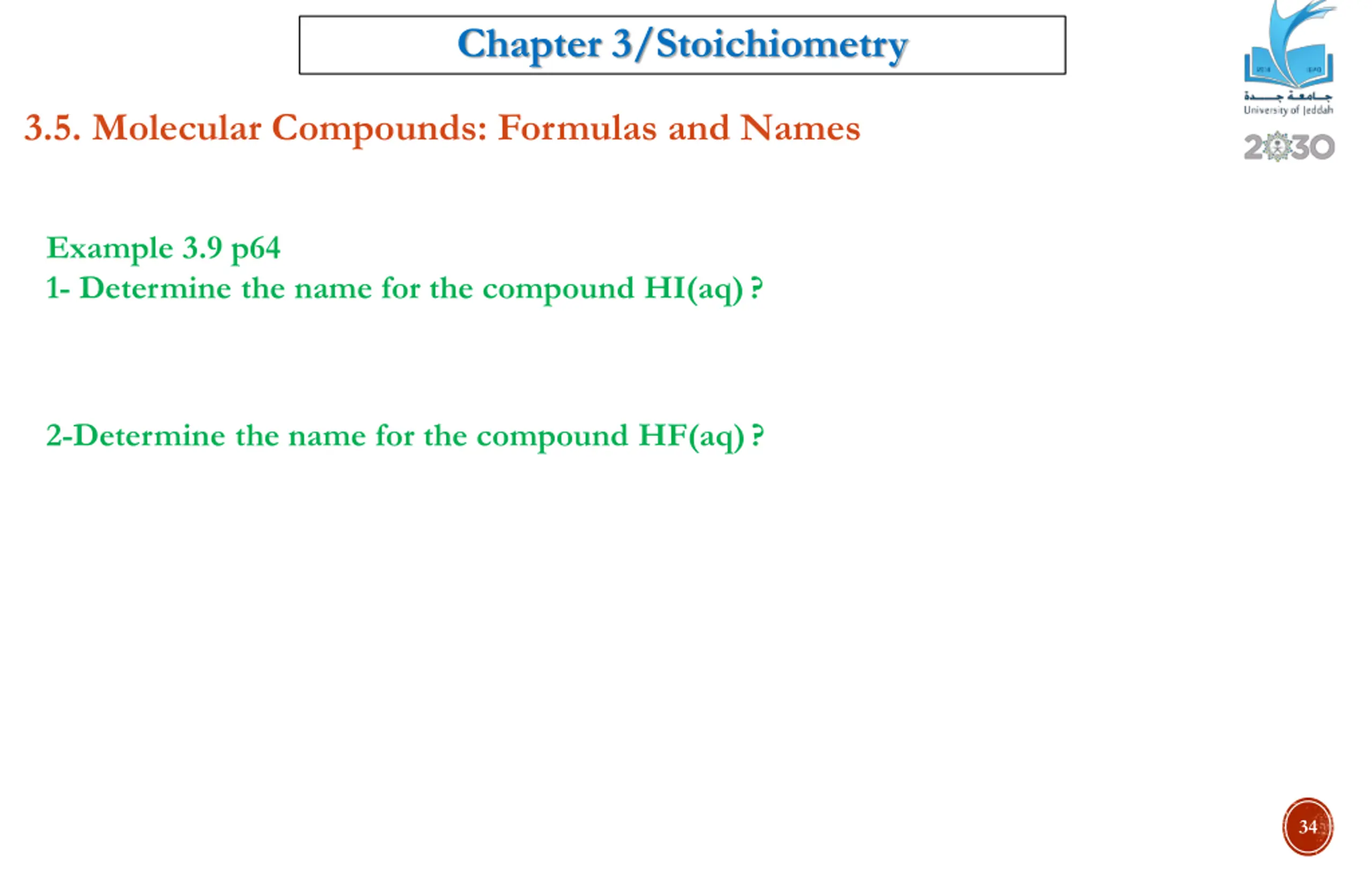 Chapter 3/Stoichiometry 3.5. Molecular Compounds: Formulas and Names Example 3.9 p64 1- Determine the name for the compound HI(aq)? 2-Determine the name for the compound HF(aq)? 34