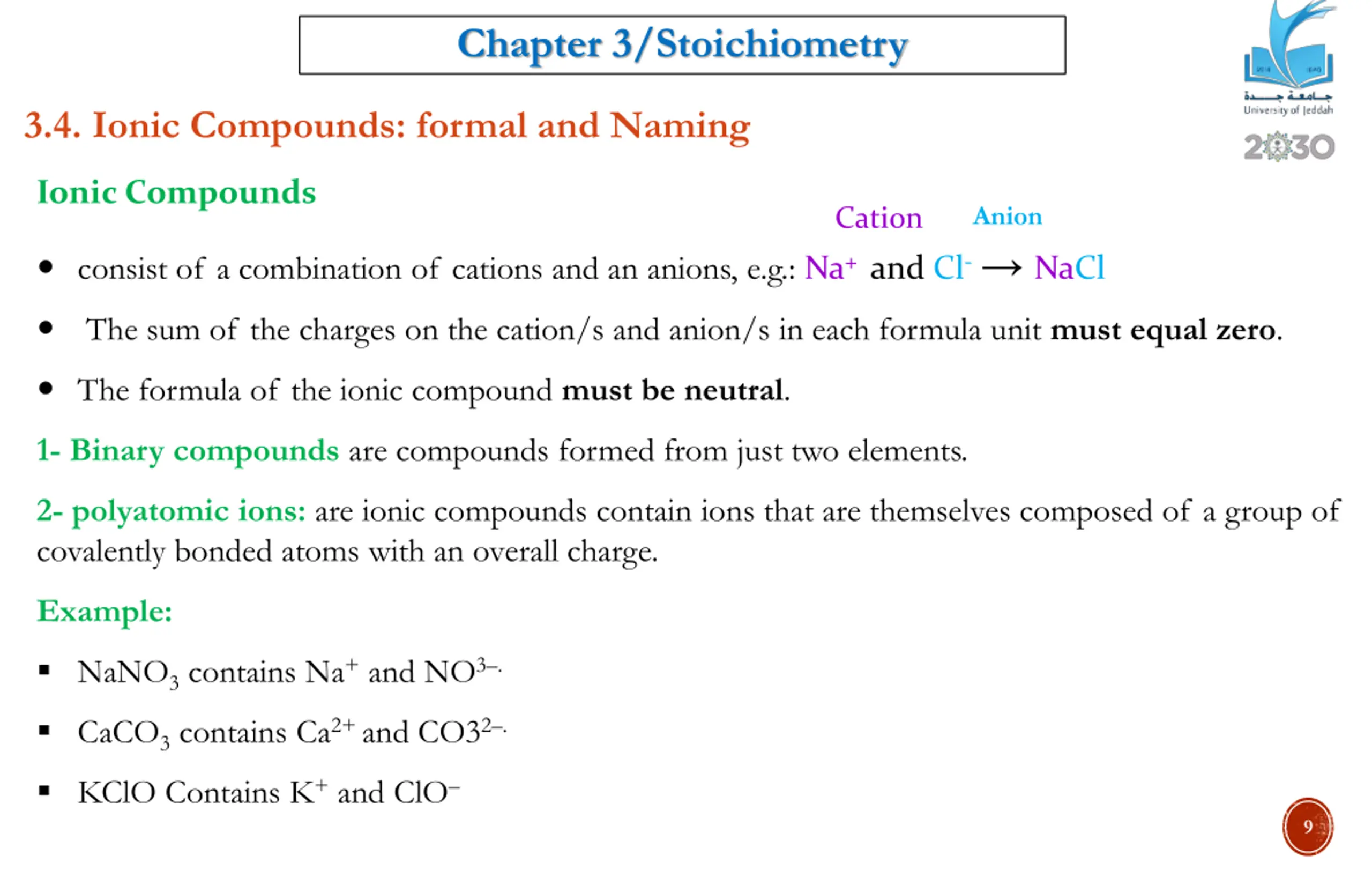 Chapter 3/Stoichiometry 3.4. Ionic Compounds: formal and Naming Ionic Compounds Anion Cation consist of a combination of cations and an anions, e.g.: Na+ and Cl- NaCl The sum of the charges on the cation/s and anion/s in each formula unit must equal zero. The formula of the ionic compound must be neutral. 1- Binary compounds are compounds formed from just two elements. 2- polyatomic ions: are ionic compounds contain ions that are themselves composed of a group of covalently bonded atoms with an overall charge. Example: NaNO3 contains Na+ and NO3 . CaCO3 contains Ca2+ and CO32 . KClO Contains K+ and ClO 9