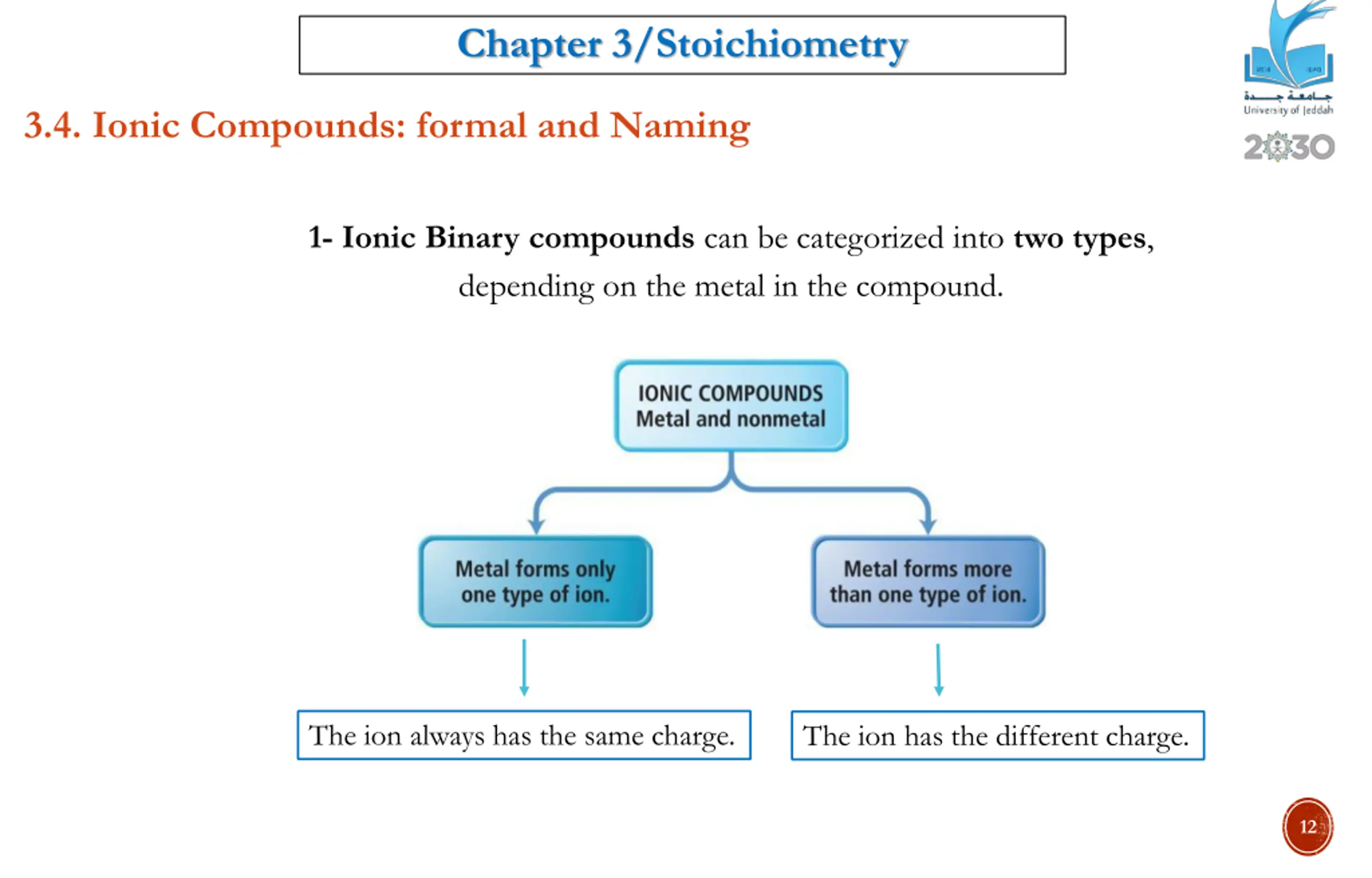 Chapter 3/Stoichiometry 3.4. Ionic Compounds: formal and Naming 1- Ionic Binary compounds can be categorized into two types, depending on the metal in the compound. The ion always has the same charge. The ion has the different charge. 12