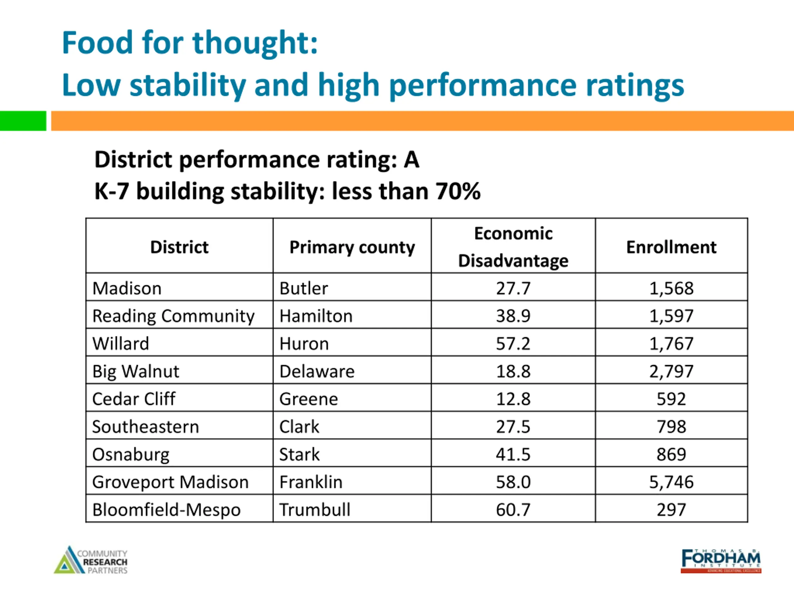 Food for thought: Low stability and high performance ratings District performance rating: A K-7 building stability: less than 70% Economic Disadvantage 27.7 38.9 57.2 18.8 12.8 27.5 41.5 58.0 60.7 District Primary county Enrollment Madison Reading Community Willard Big Walnut Cedar Cliff Southeastern Osnaburg Groveport Madison Bloomfield-Mespo Butler Hamilton Huron Delaware Greene Clark Stark Franklin Trumbull 1,568 1,597 1,767 2,797 592 798 869 5,746 297