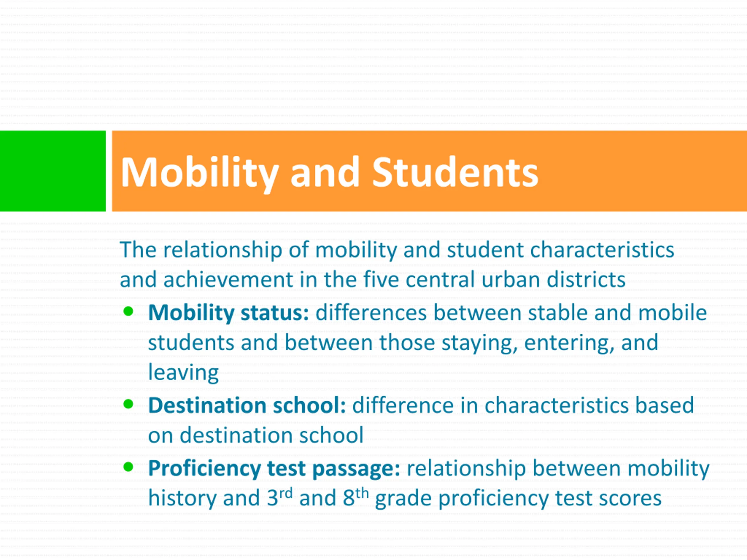 Mobility and Students The relationship of mobility and student characteristics and achievement in the five central urban districts Mobility status: differences between stable and mobile students and between those staying, entering, and leaving Destination school: difference in characteristics based on destination school Proficiency test passage: relationship between mobility history and 3rd and 8th grade proficiency test scores