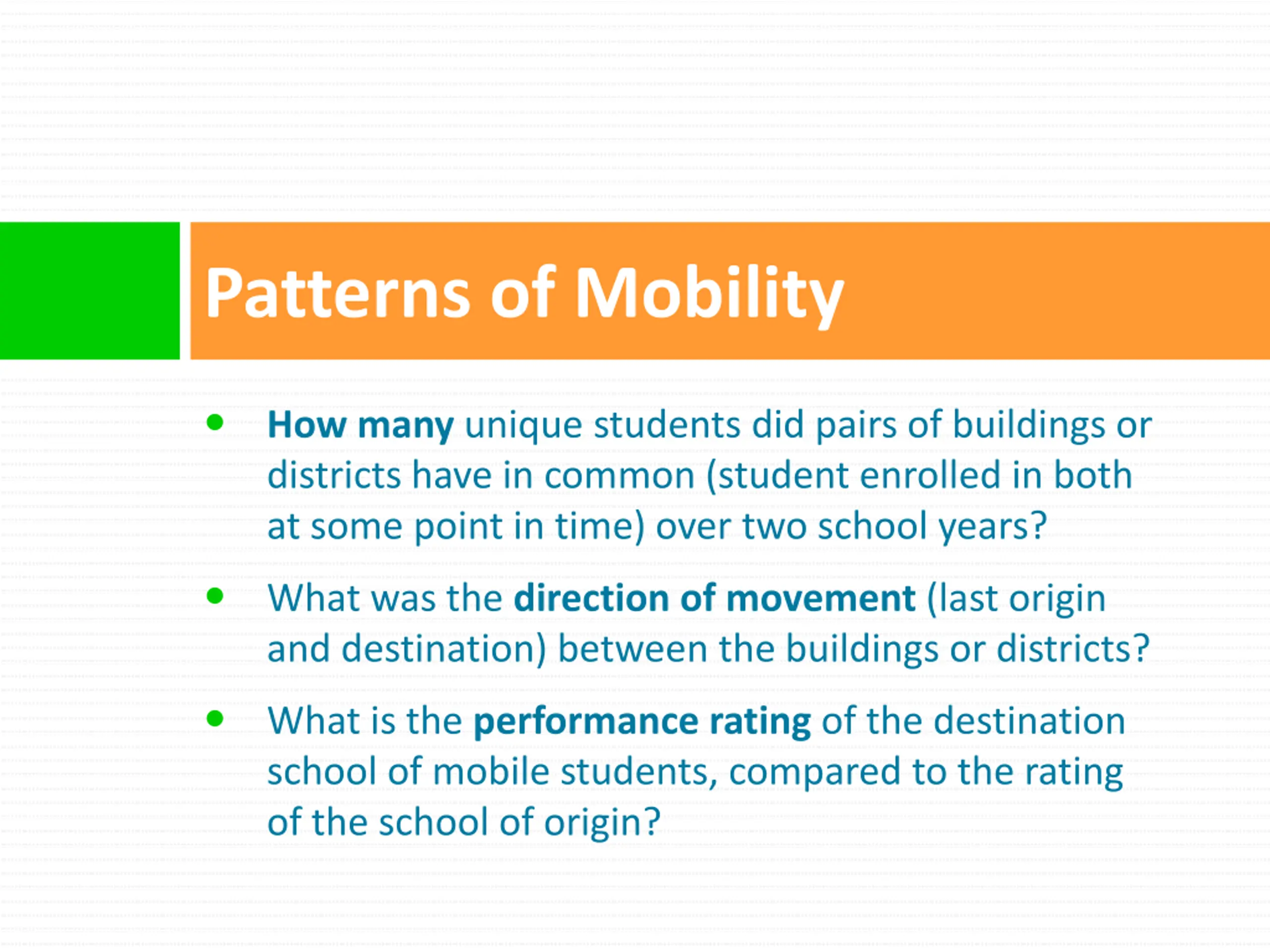 Patterns of Mobility How many unique students did pairs of buildings or districts have in common (student enrolled in both at some point in time) over two school years? What was the direction of movement (last origin and destination) between the buildings or districts? What is the performance rating of the destination school of mobile students, compared to the rating of the school of origin?