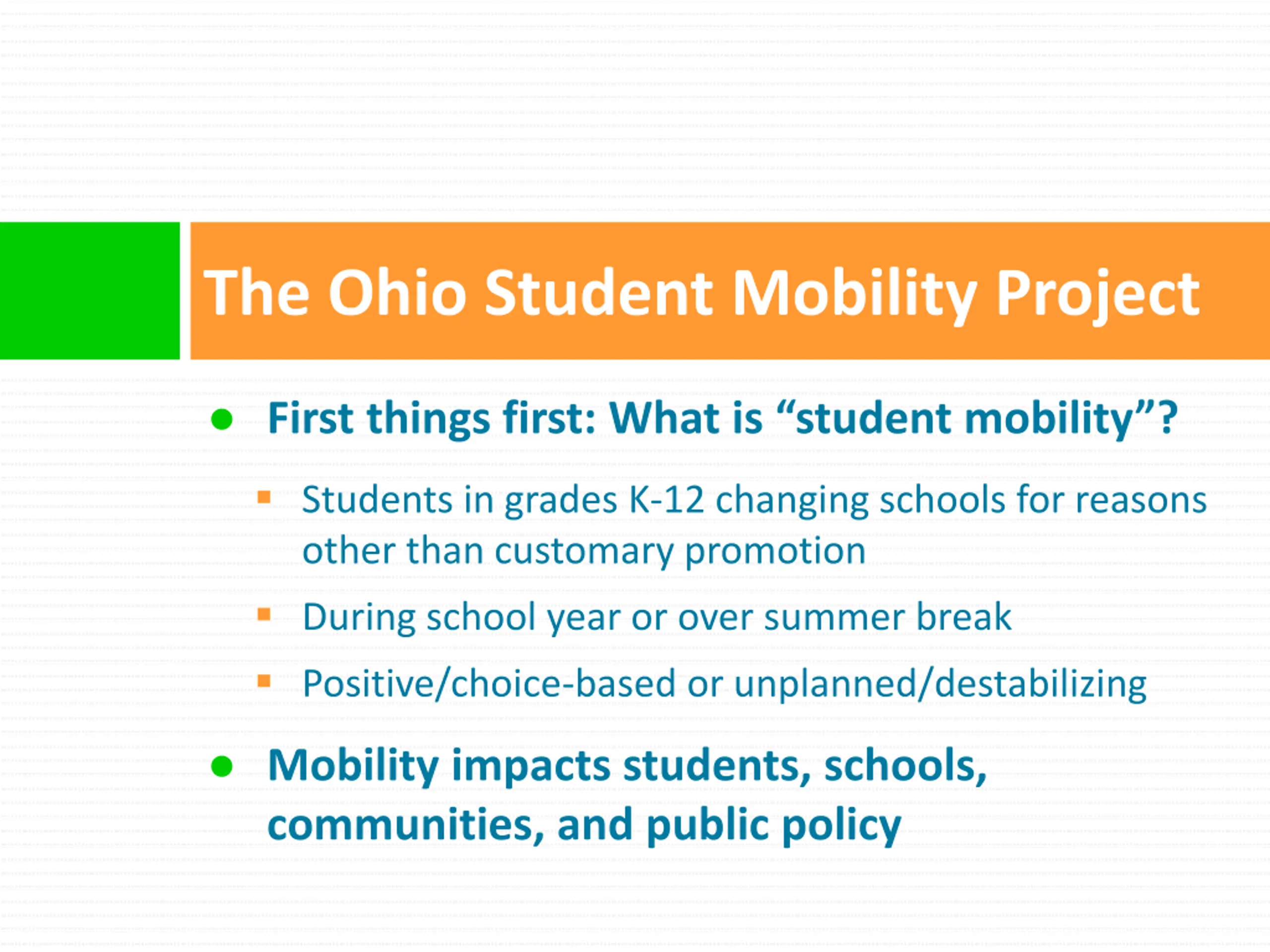 The Ohio Student Mobility Project First things first: What is student mobility ? Students in grades K-12 changing schools for reasons other than customary promotion During school year or over summer break Positive/choice-based or unplanned/destabilizing Mobility impacts students, schools, communities, and public policy