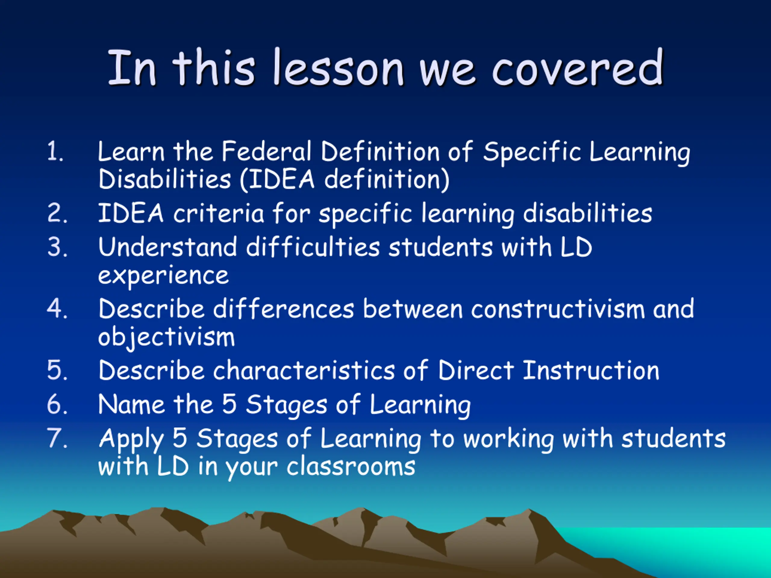 In this lesson we covered 1. Learn the Federal Definition of Specific Learning Disabilities (IDEA definition) IDEA criteria for specific learning disabilities Understand difficulties students with LD experience Describe differences between constructivism and objectivism Describe characteristics of Direct Instruction Name the 5 Stages of Learning Apply 5 Stages of Learning to working with students with LD in your classrooms 2. 3. 4. 5. 6. 7.