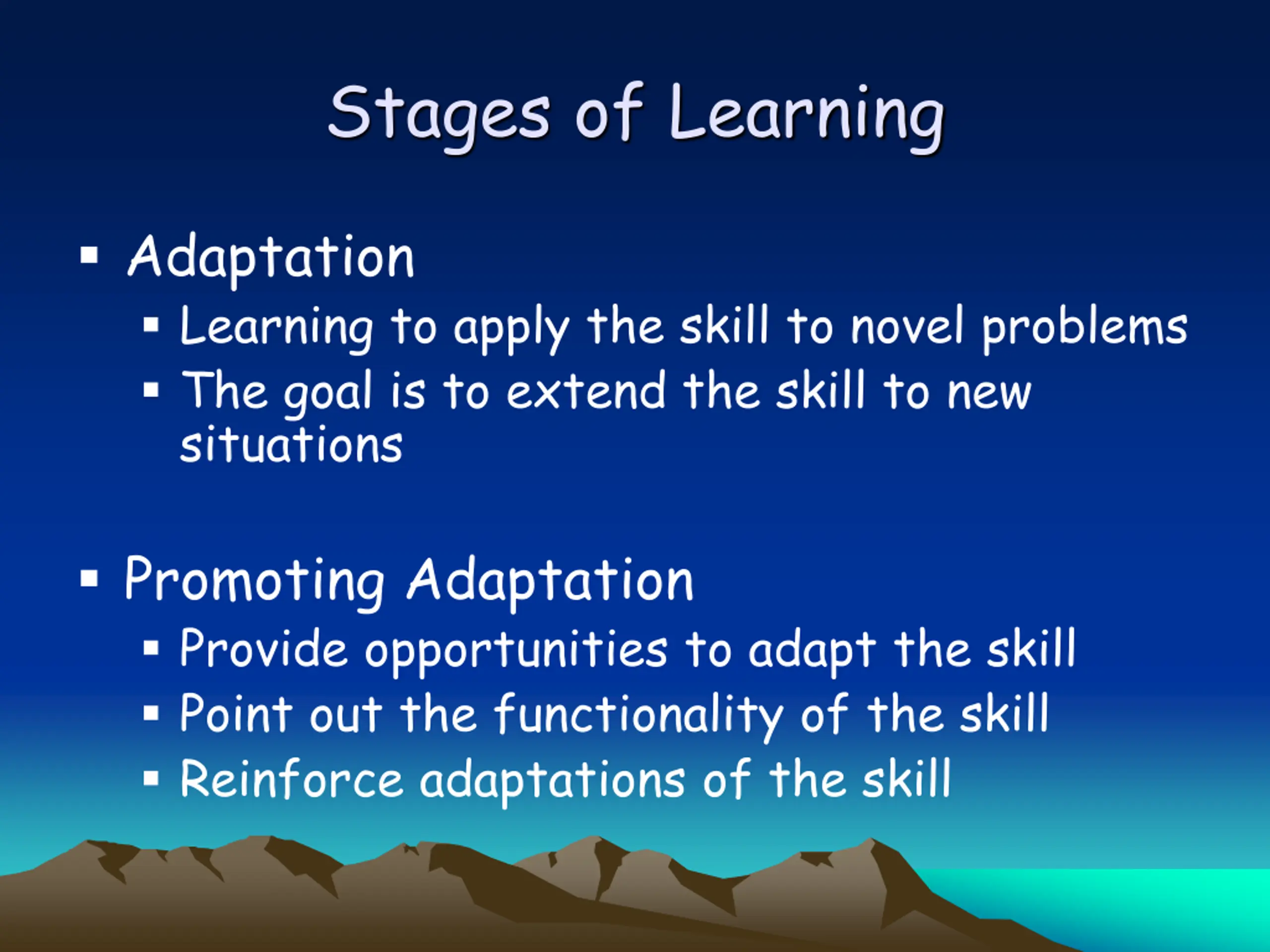 Stages of Learning Adaptation Learning to apply the skill to novel problems The goal is to extend the skill to new situations Promoting Adaptation Provide opportunities to adapt the skill Point out the functionality of the skill Reinforce adaptations of the skill