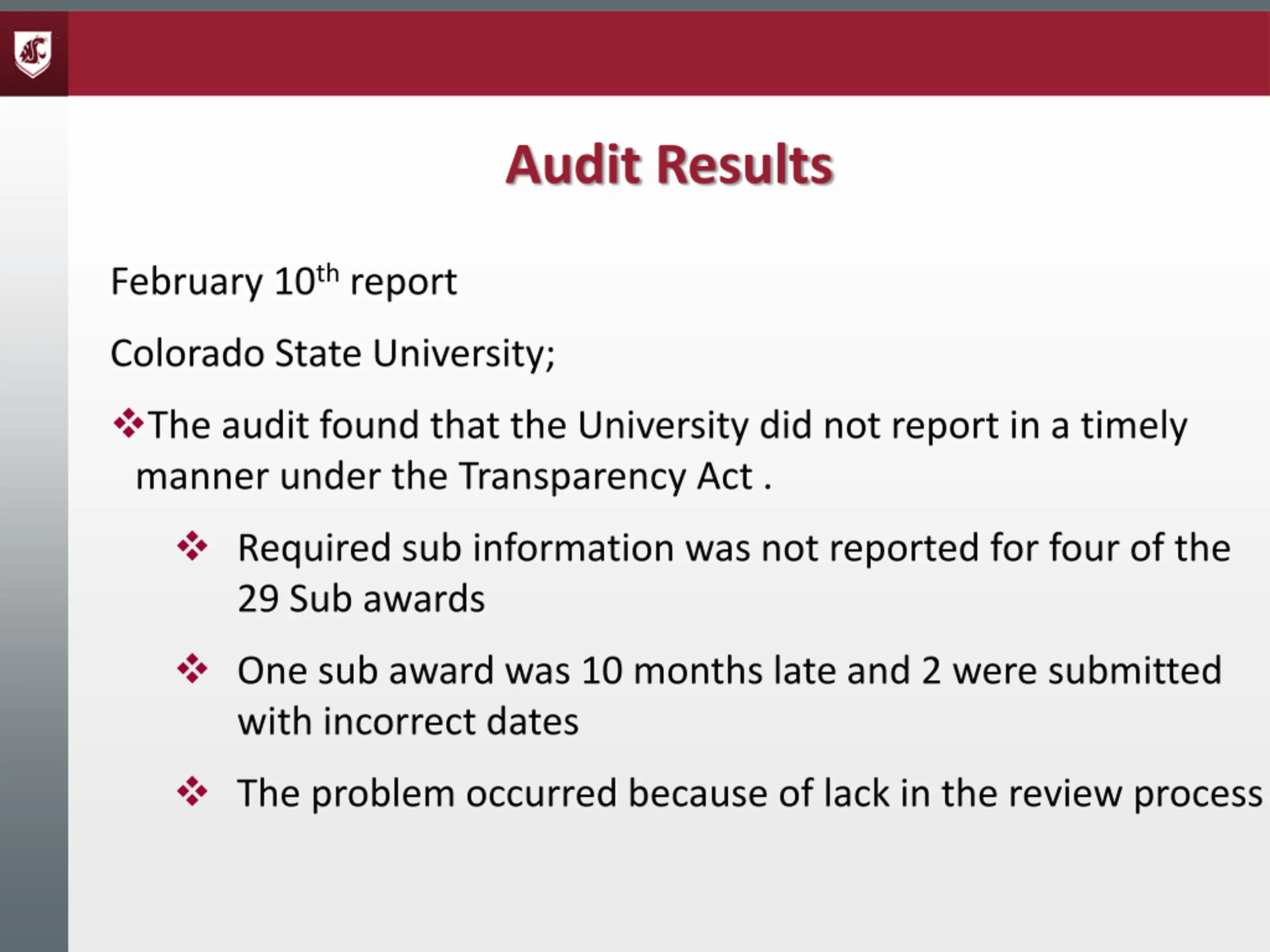 Audit Results February 10threport Colorado State University; The audit found that the University did not report in a timely manner under the Transparency Act . Required sub information was not reported for four of the 29 Sub awards One sub award was 10 months late and 2 were submitted with incorrect dates The problem occurred because of lack in the review process