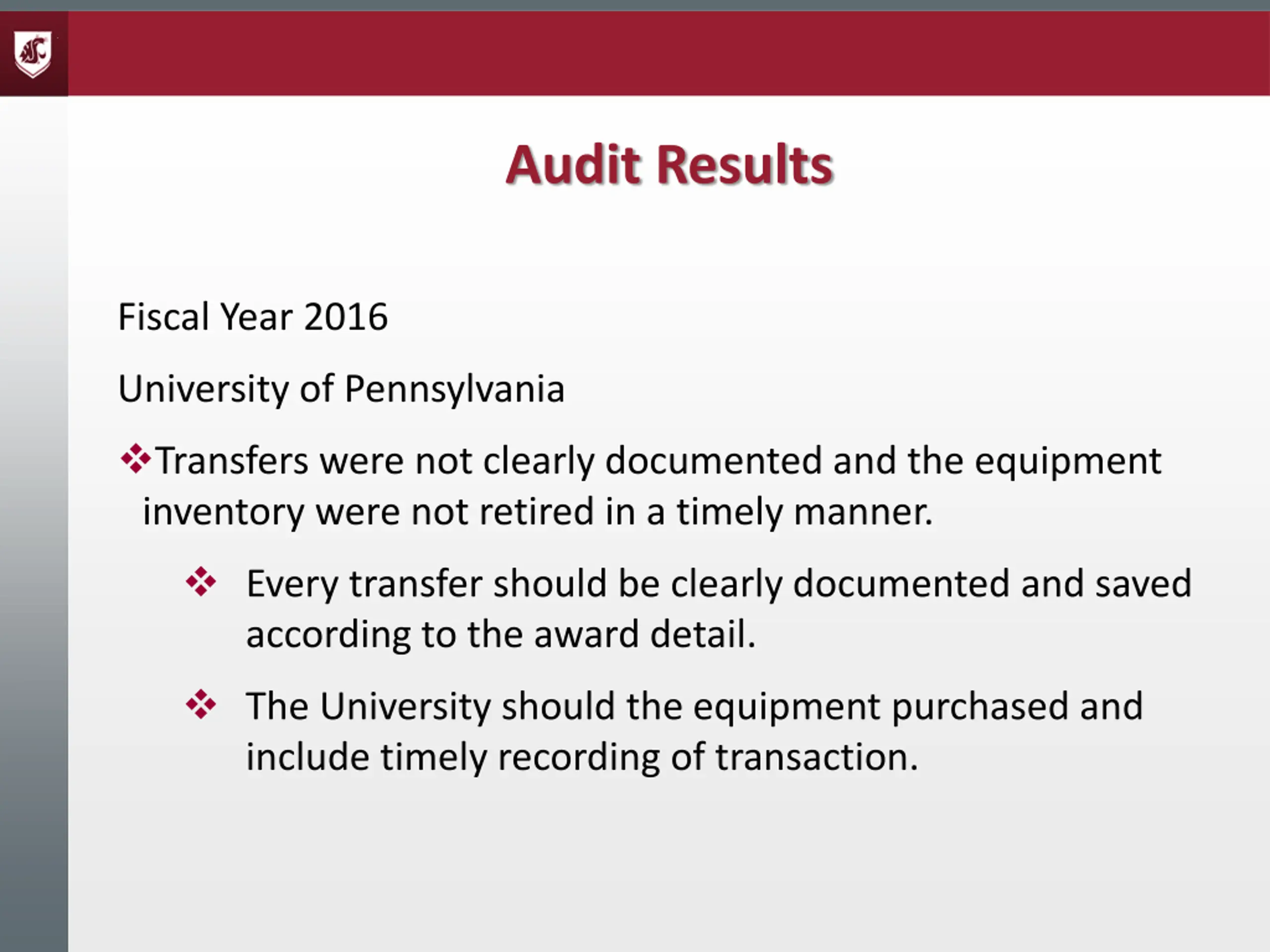Audit Results Fiscal Year 2016 University of Pennsylvania Transfers were not clearly documented and the equipment inventory were not retired in a timely manner. Every transfer should be clearly documented and saved according to the award detail. The University should the equipment purchased and include timely recording of transaction.
