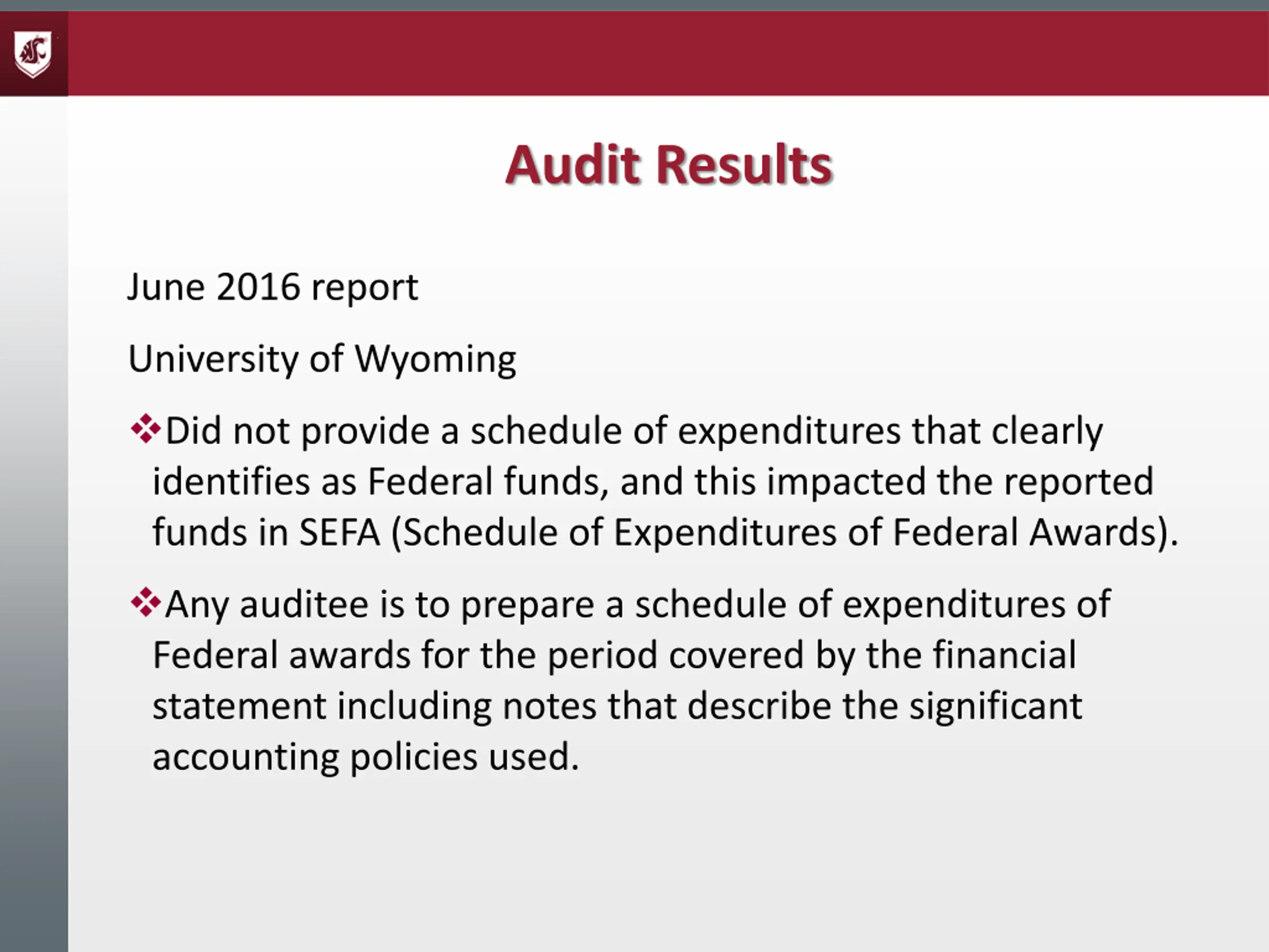 Audit Results June 2016 report University of Wyoming Did not provide a schedule of expenditures that clearly identifies as Federal funds, and this impacted the reported funds in SEFA (Schedule of Expenditures of Federal Awards). Any auditee is to prepare a schedule of expenditures of Federal awards for the period covered by the financial statement including notes that describe the significant accounting policies used.