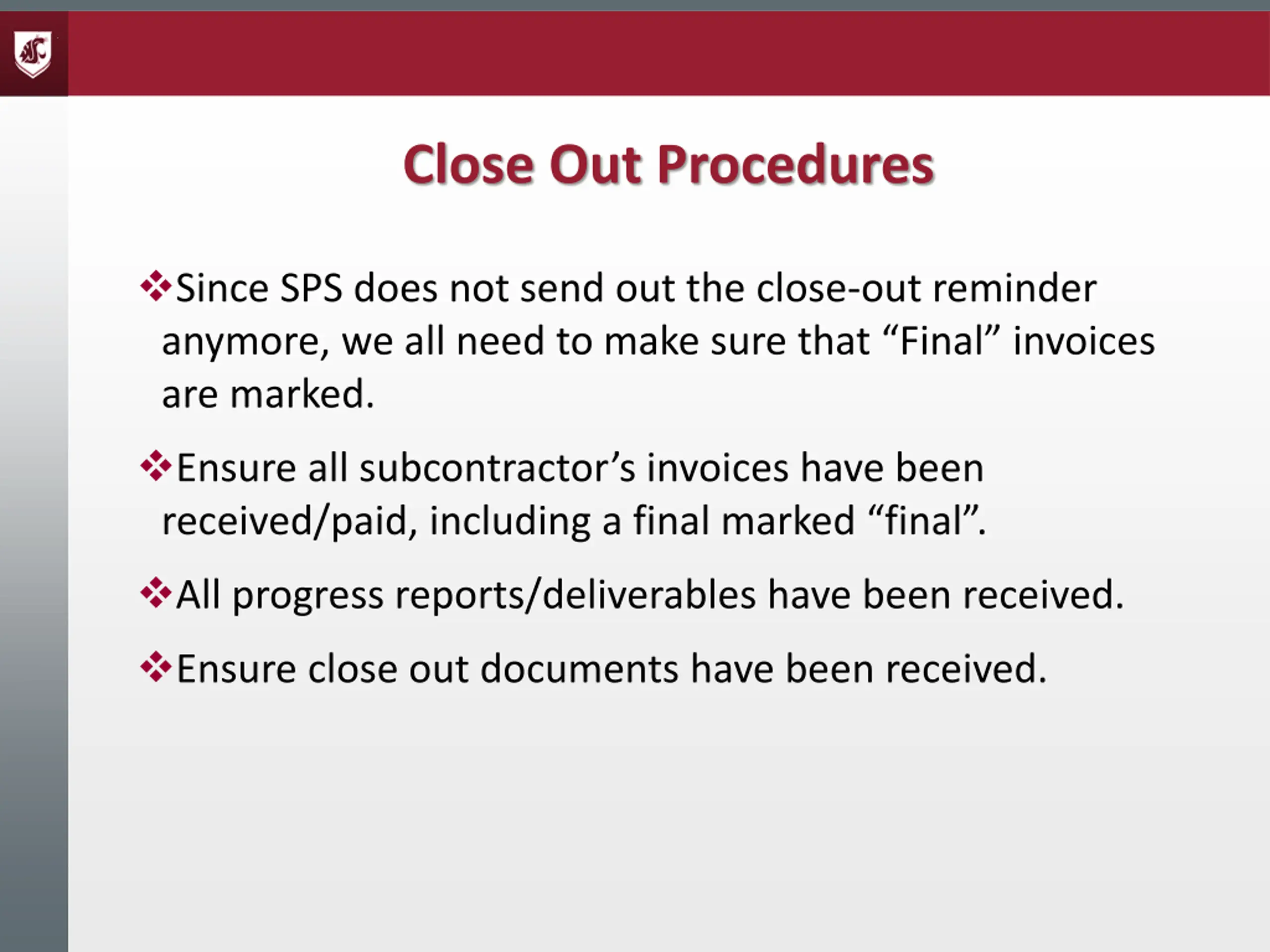 Close Out Procedures Since SPS does not send out the close-out reminder anymore, we all need to make sure that Final invoices are marked. Ensure all subcontractor s invoices have been received/paid, including a final marked final . All progress reports/deliverables have been received. Ensure close out documents have been received.