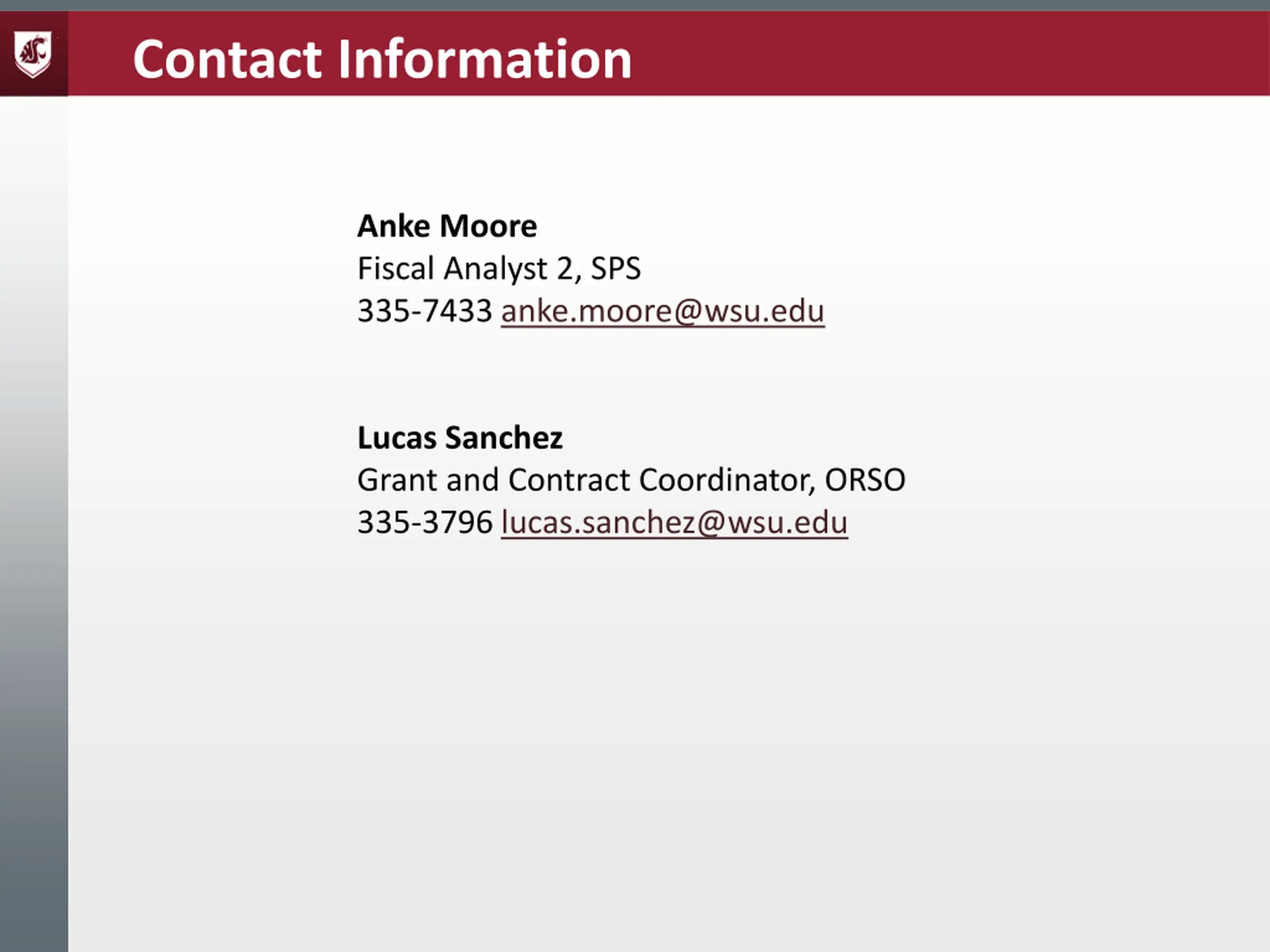 Contact Information Anke Moore Fiscal Analyst 2, SPS 335-7433 anke.moore@wsu.edu Lucas Sanchez Grant and Contract Coordinator, ORSO 335-3796 lucas.sanchez@wsu.edu