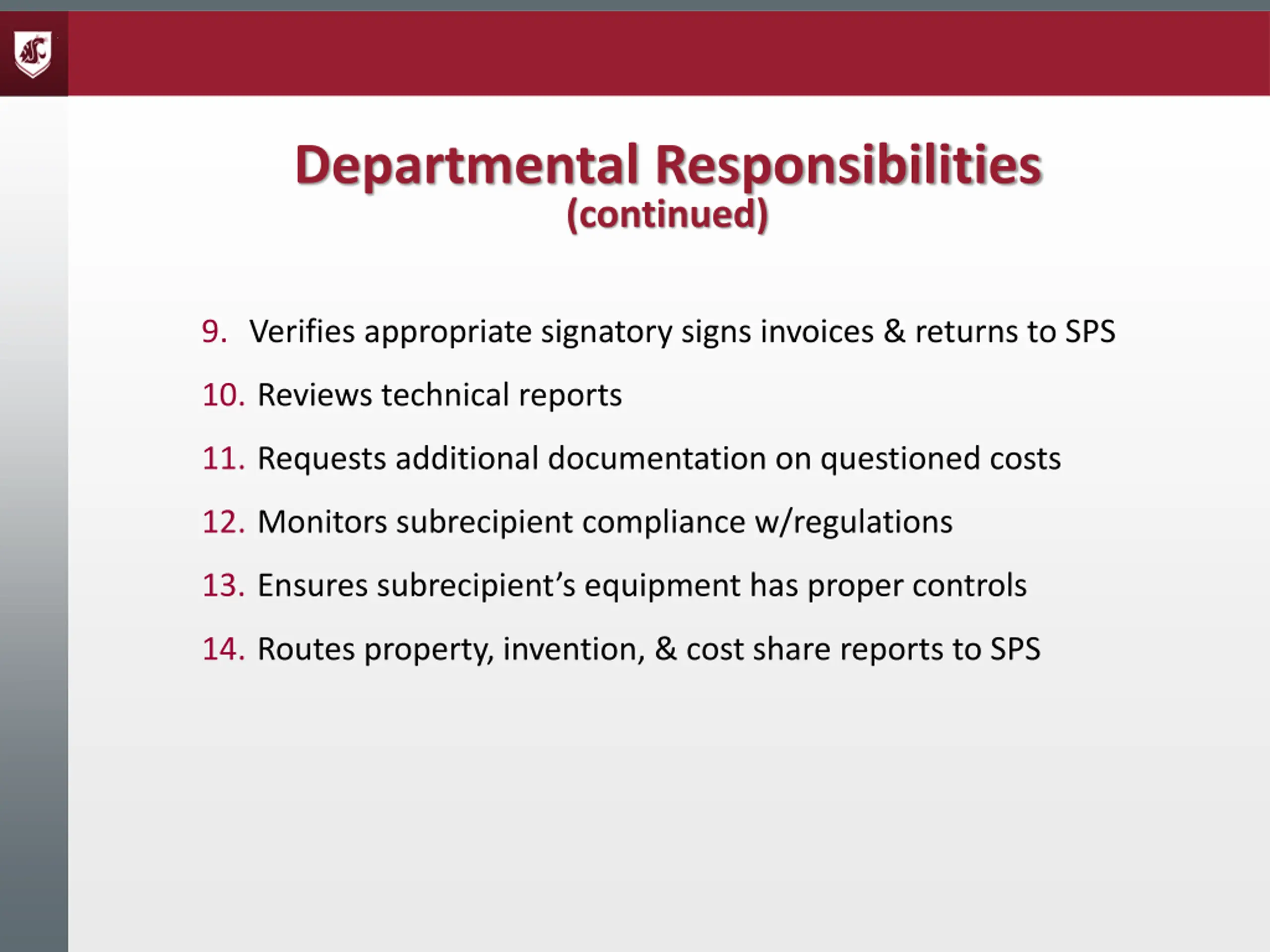 Departmental Responsibilities (continued) 9. Verifies appropriate signatory signs invoices & returns to SPS 10. Reviews technical reports 11. Requests additional documentation on questioned costs 12. Monitors subrecipient compliance w/regulations 13. Ensures subrecipient s equipment has proper controls 14. Routes property, invention, & cost share reports to SPS