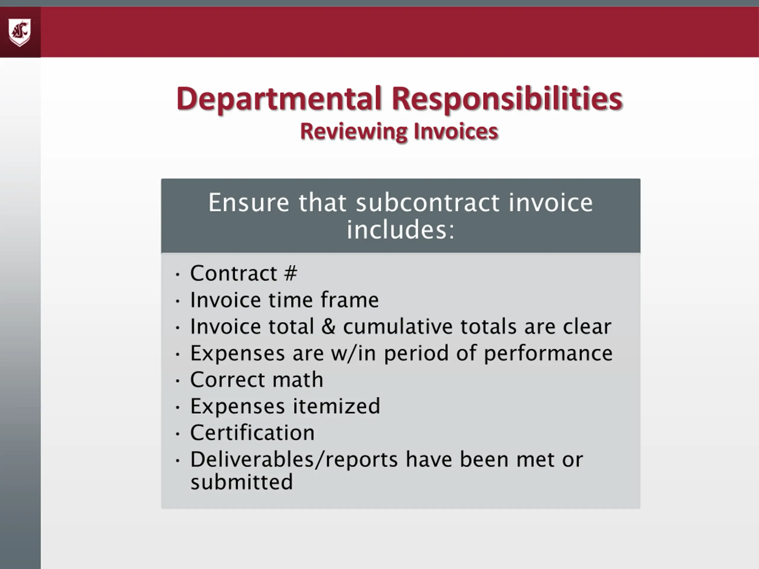 Departmental Responsibilities Reviewing Invoices Ensure that subcontract invoice includes: Contract # Invoice time frame Invoice total & cumulative totals are clear Expenses are w/in period of performance Correct math Expenses itemized Certification Deliverables/reports have been met or submitted