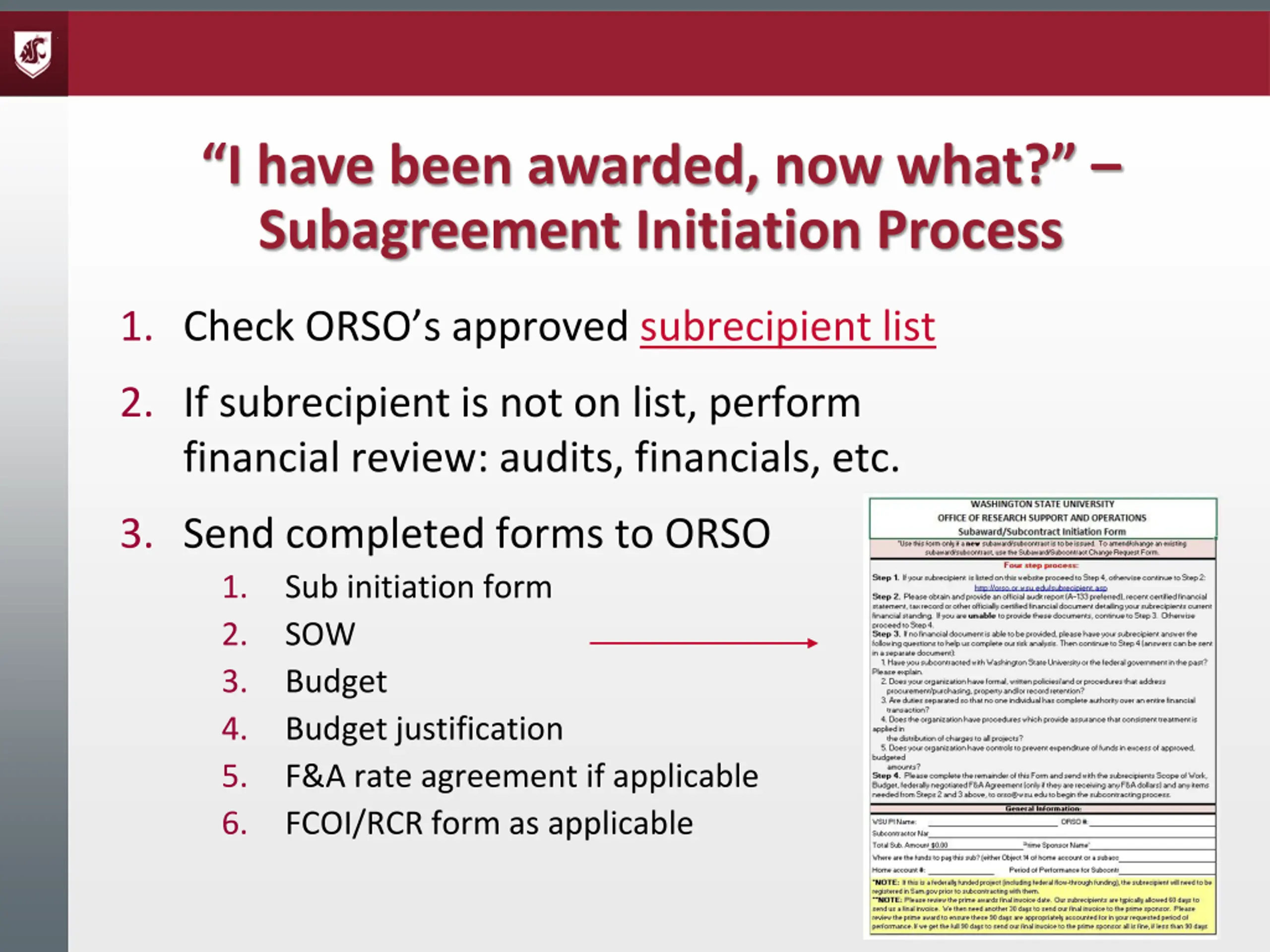 I have been awarded, now what? Subagreement Initiation Process 1. Check ORSO s approved subrecipient list 2. If subrecipient is not on list, perform financial review: audits, financials, etc. 3. Send completed forms to ORSO 1. Sub initiation form 2. SOW 3. Budget 4. Budget justification 5. F&A rate agreement if applicable 6. FCOI/RCR form as applicable