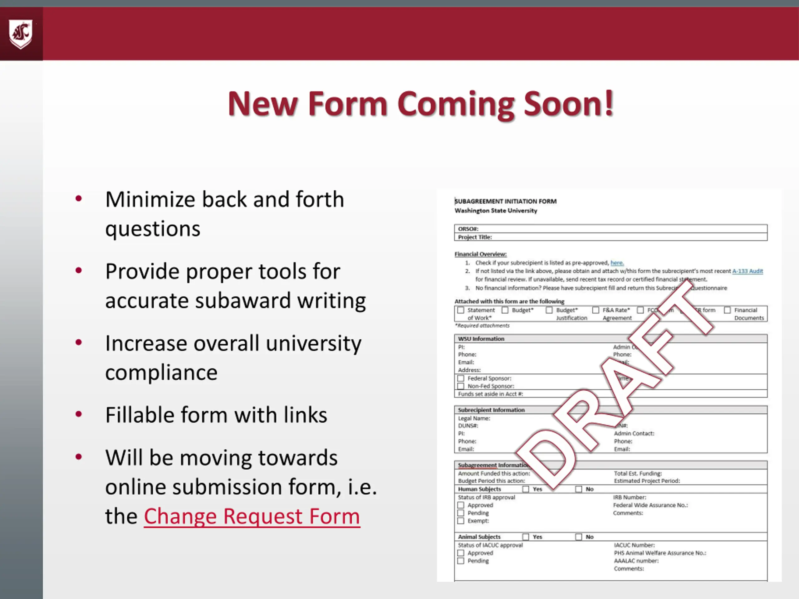 New Form Coming Soon! Minimize back and forth questions Provide proper tools for accurate subaward writing DRAFT Increase overall university compliance Fillable form with links Will be moving towards online submission form, i.e. the Change Request Form