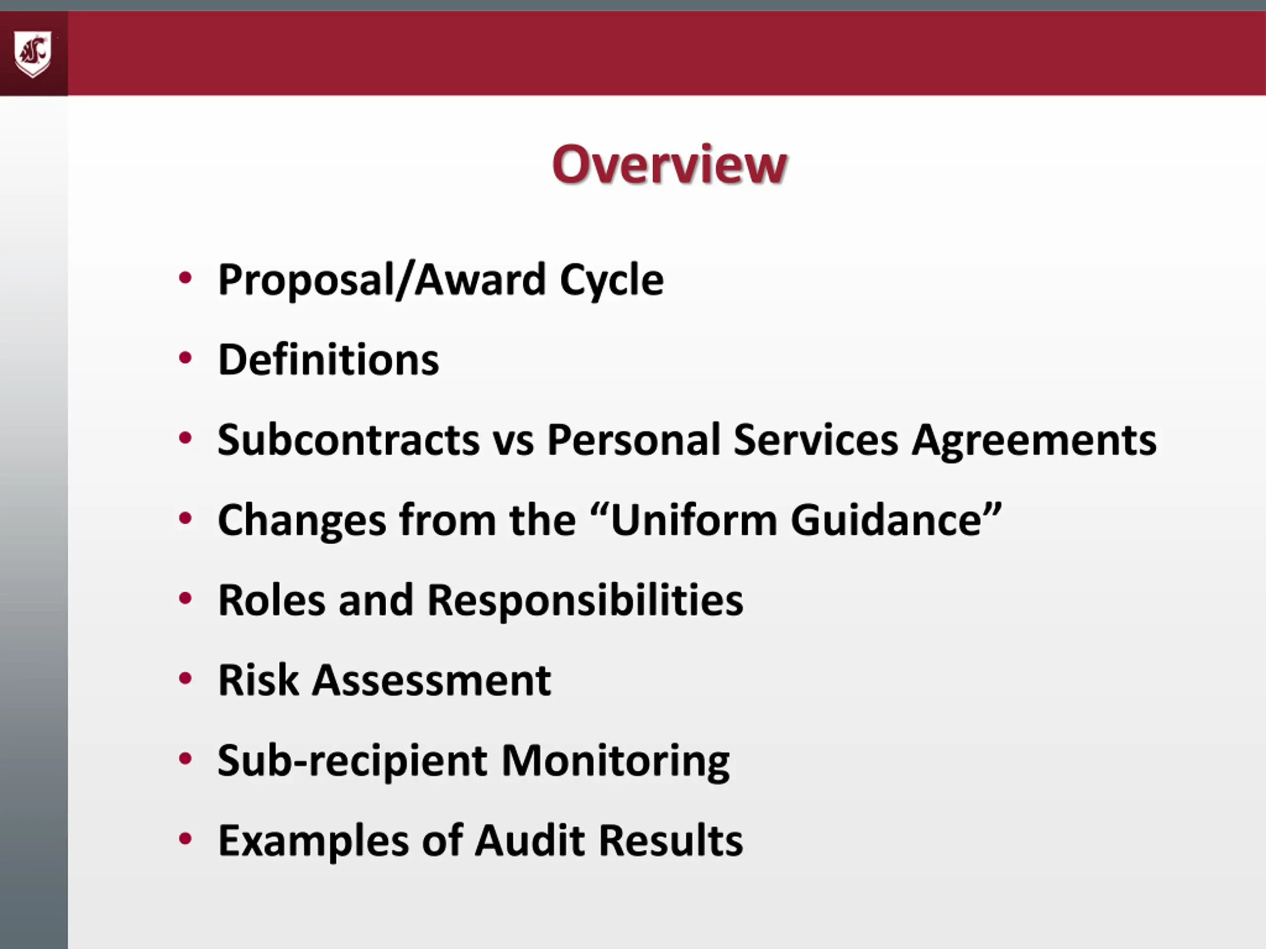 Overview Proposal/Award Cycle Definitions Subcontracts vs Personal Services Agreements Changes from the Uniform Guidance Roles and Responsibilities Risk Assessment Sub-recipient Monitoring Examples of Audit Results