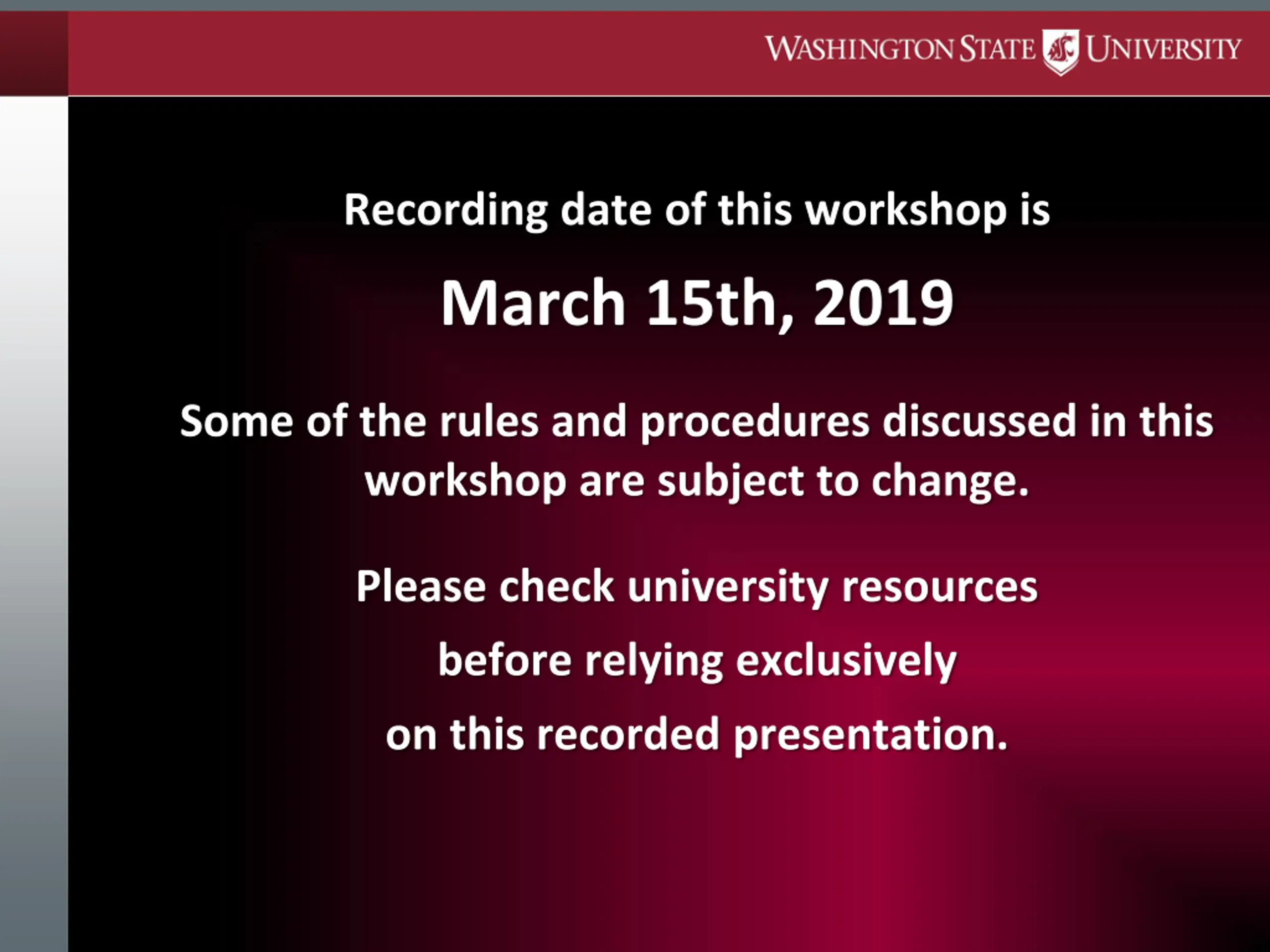 Recording date of this workshop is March 15th, 2019 Some of the rules and procedures discussed in this workshop are subject to change. Please check university resources before relying exclusively on this recorded presentation.