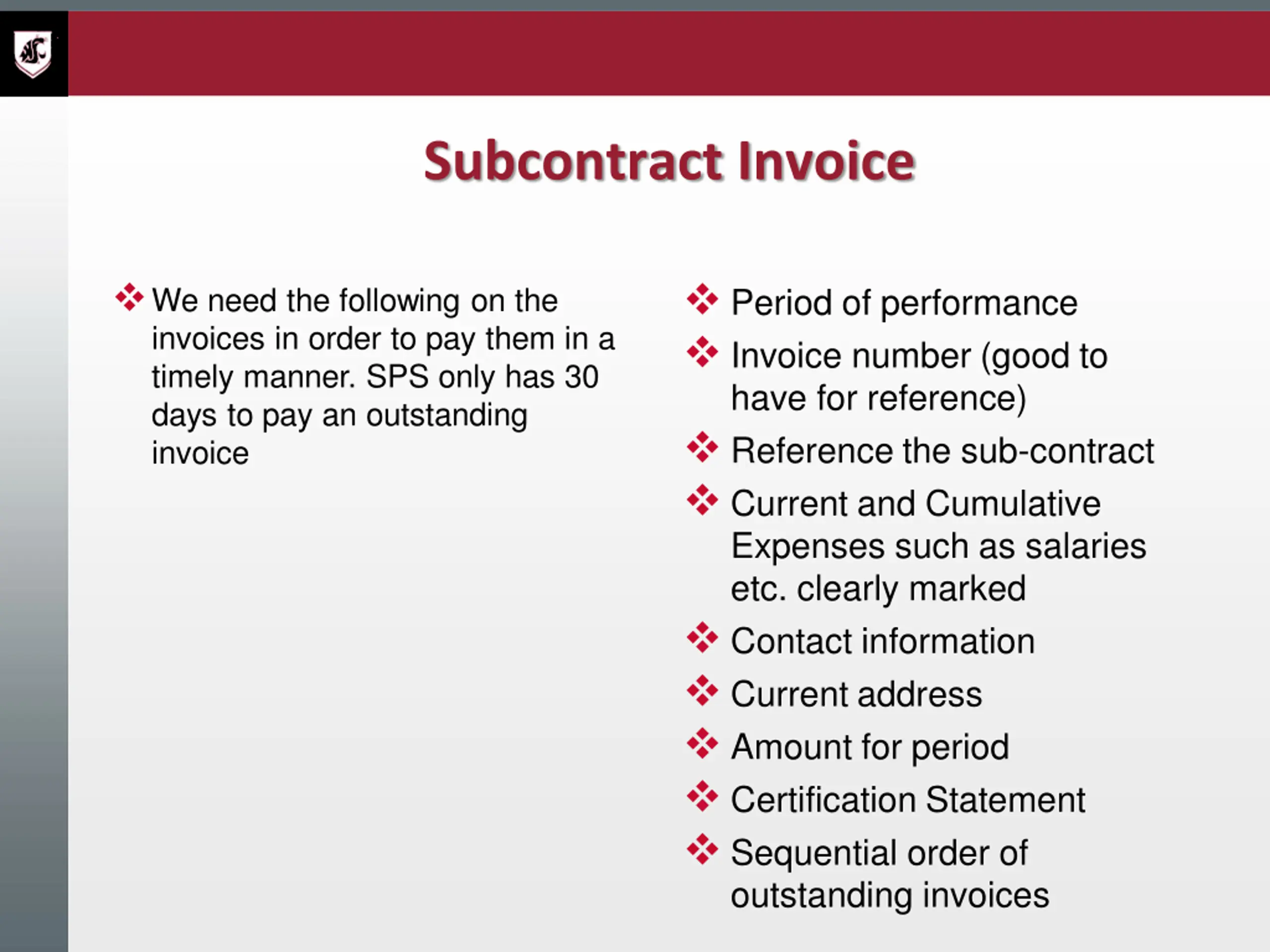 Subcontract Invoice Period of performance Invoice number (good to have for reference) Reference the sub-contract Current and Cumulative Expenses such as salaries etc. clearly marked Contact information Current address Amount for period Certification Statement Sequential order of outstanding invoices We need the following on the invoices in order to pay them in a timely manner. SPS only has 30 days to pay an outstanding invoice