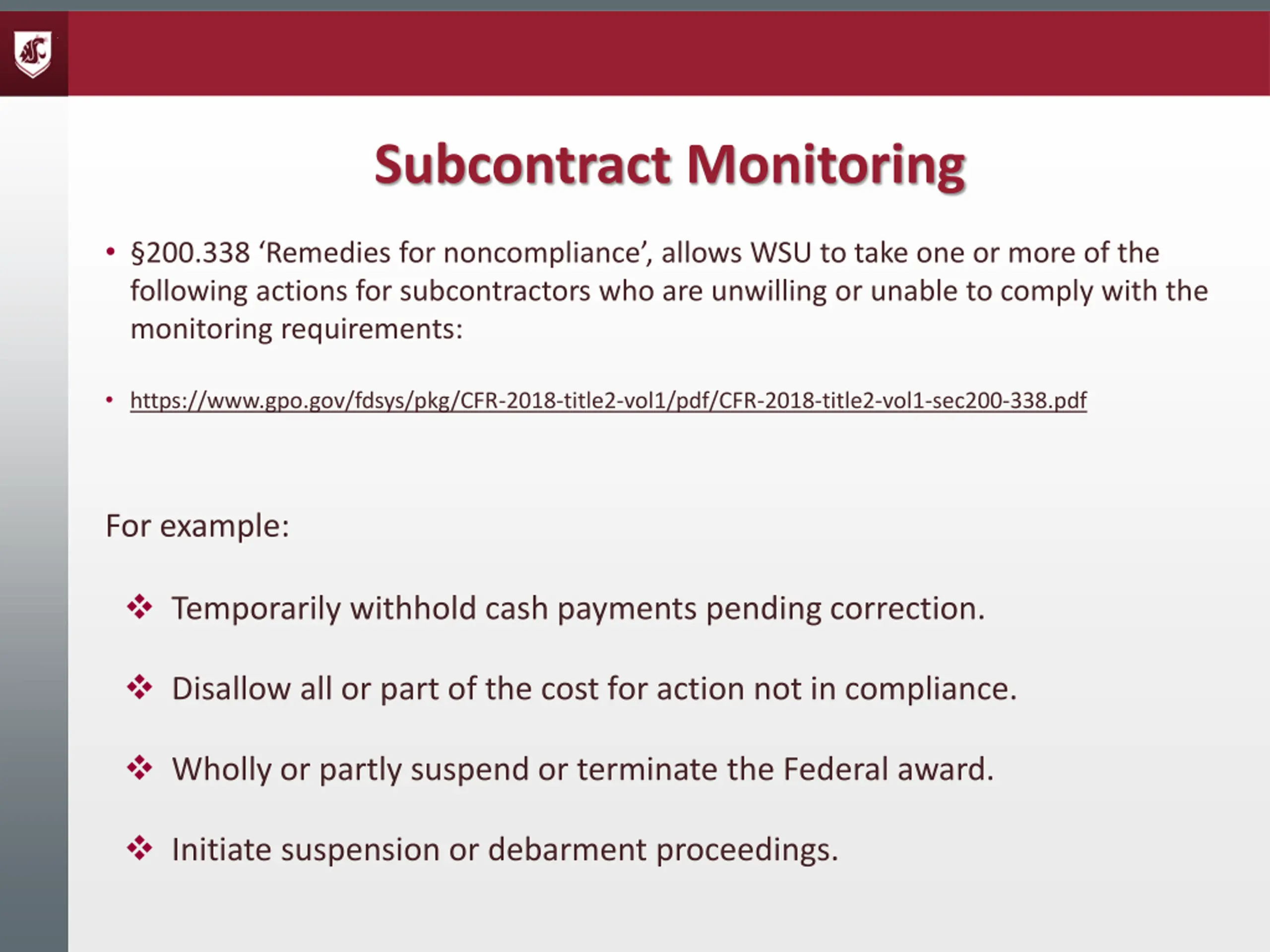 Subcontract Monitoring 200.338 Remedies for noncompliance , allows WSU to take one or more of the following actions for subcontractors who are unwilling or unable to comply with the monitoring requirements: https://www.gpo.gov/fdsys/pkg/CFR-2018-title2-vol1/pdf/CFR-2018-title2-vol1-sec200-338.pdf For example: Temporarily withhold cash payments pending correction. Disallow all or part of the cost for action not in compliance. Wholly or partly suspend or terminate the Federal award. Initiate suspension or debarment proceedings.