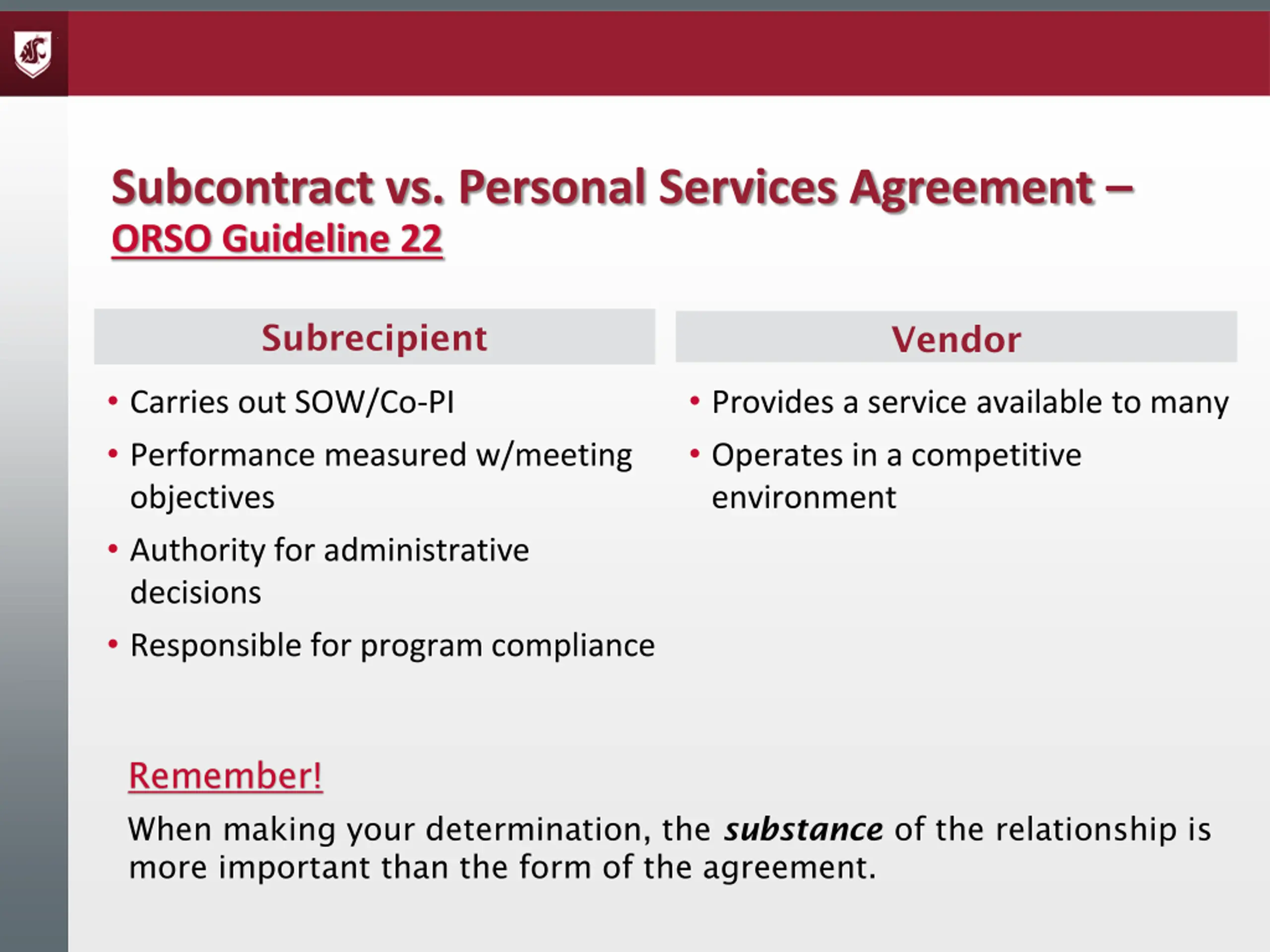 Subcontract vs. Personal Services Agreement ORSO Guideline 22 Subrecipient Vendor Carries out SOW/Co-PI Performance measured w/meeting objectives Authority for administrative decisions Responsible for program compliance Provides a service available to many Operates in a competitive environment Remember! When making your determination, the substance of the relationship is more important than the form of the agreement.