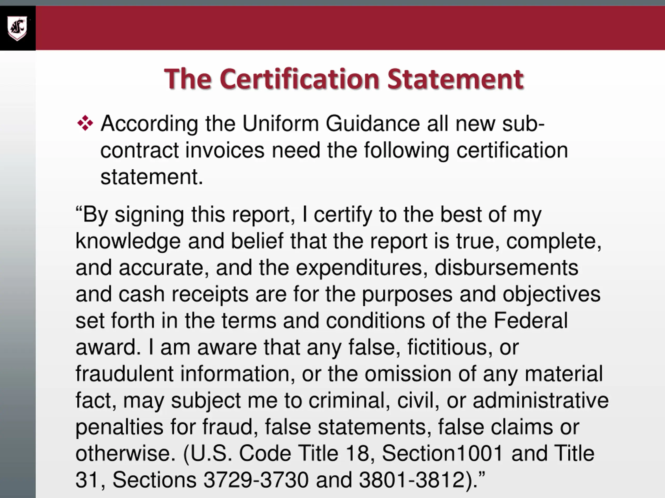 The Certification Statement According the Uniform Guidance all new sub- contract invoices need the following certification statement. By signing this report, I certify to the best of my knowledge and belief that the report is true, complete, and accurate, and the expenditures, disbursements and cash receipts are for the purposes and objectives set forth in the terms and conditions of the Federal award. I am aware that any false, fictitious, or fraudulent information, or the omission of any material fact, may subject me to criminal, civil, or administrative penalties for fraud, false statements, false claims or otherwise. (U.S. Code Title 18, Section1001 and Title 31, Sections 3729-3730 and 3801-3812).