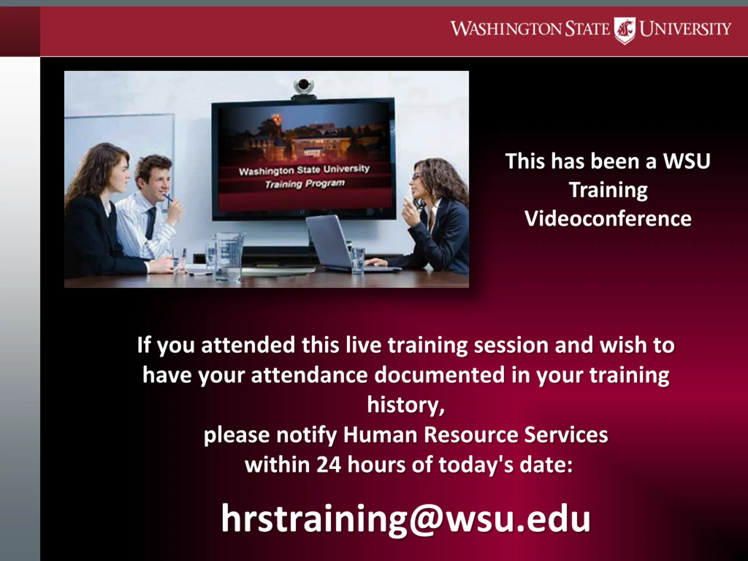 This has been a WSU Training Videoconference If you attended this live training session and wish to have your attendance documented in your training history, please notify Human Resource Services within 24 hours of today's date: hrstraining@wsu.edu
