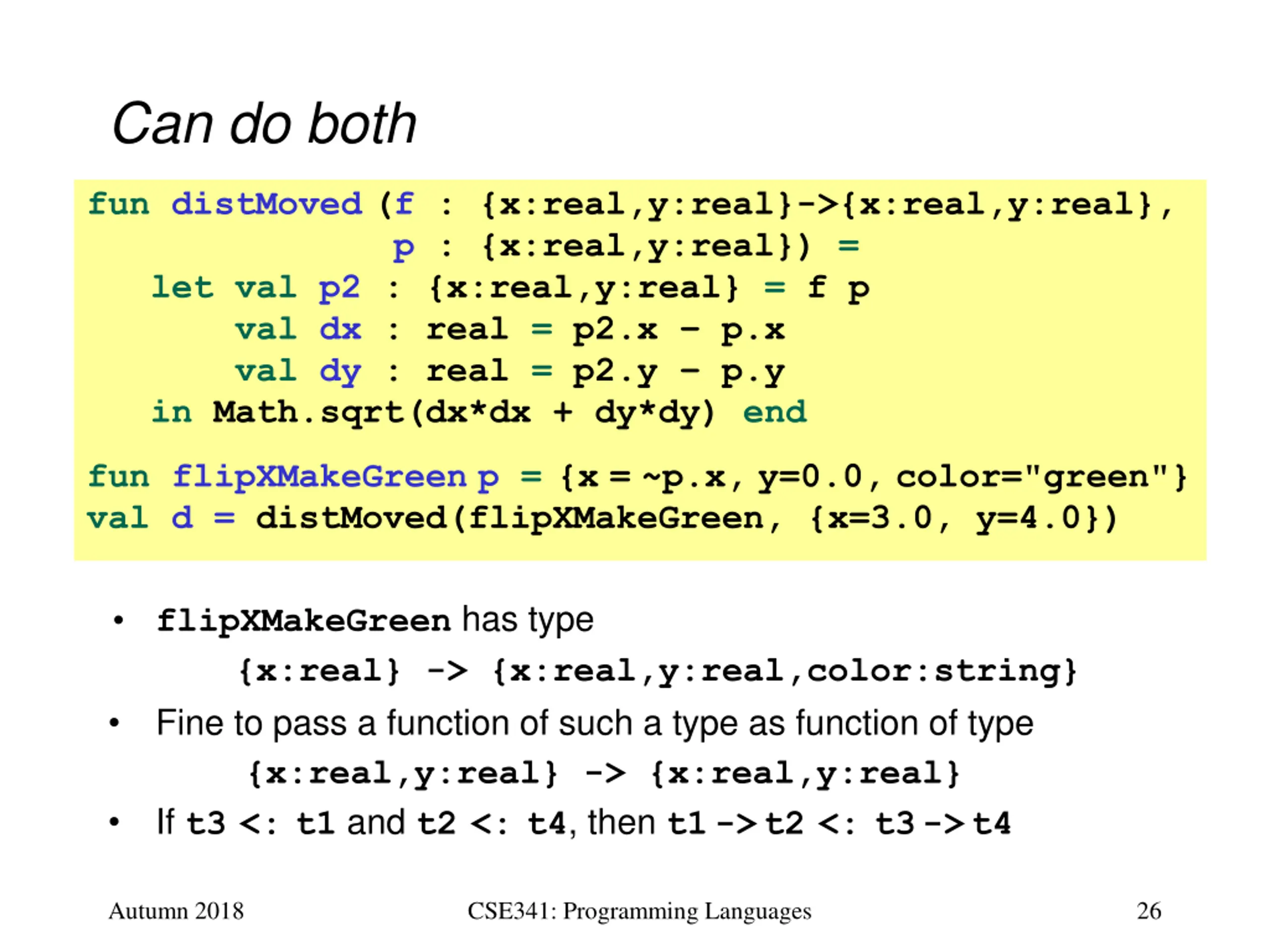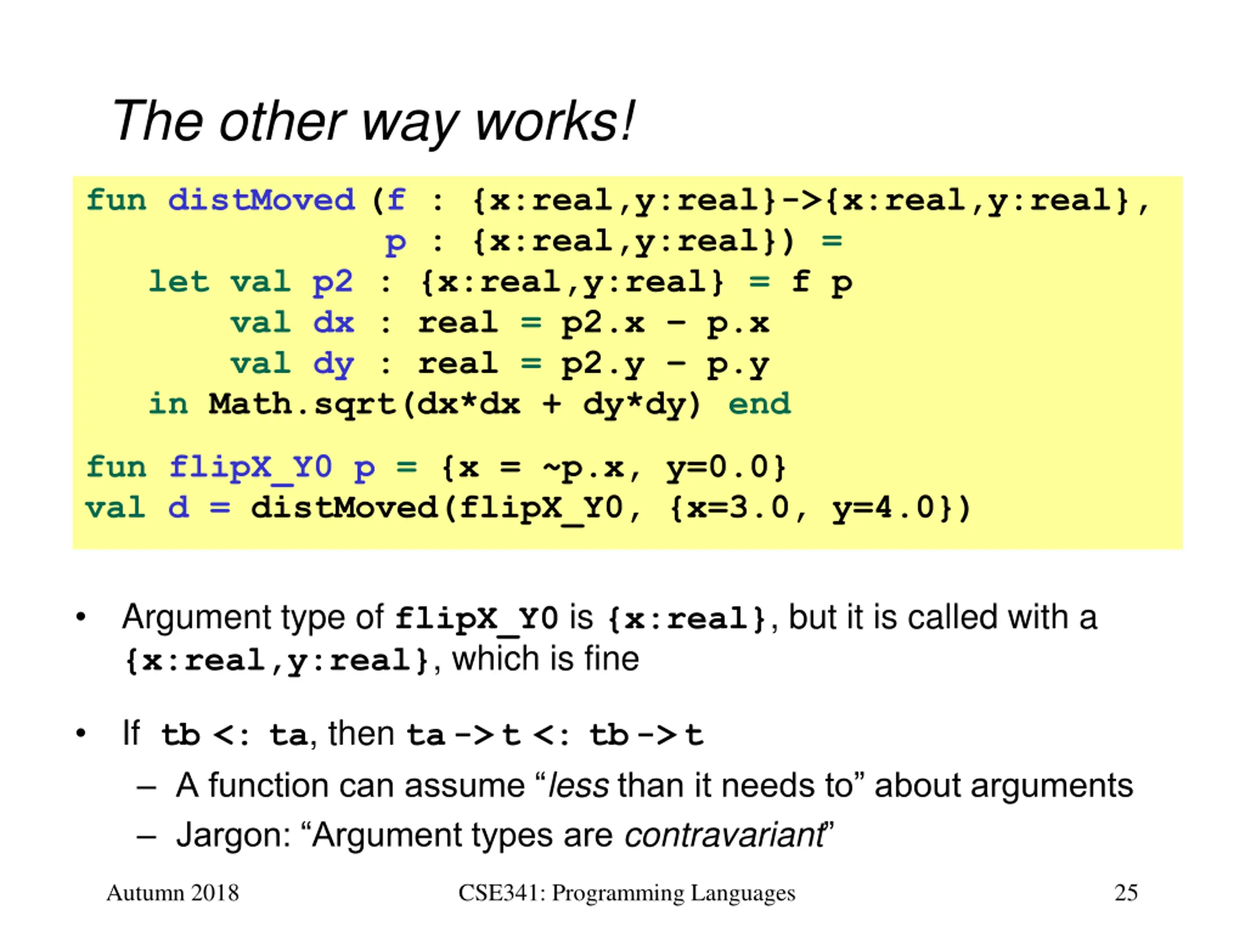 The other way works! fun distMoved(f : {x:real,y:real}->{x:real,y:real}, p : {x:real,y:real}) = let val p2 : {x:real,y:real} = f p val dx : real = p2.x p.x val dy : real = p2.y p.y in Math.sqrt(dx*dx + dy*dy) end fun flipX_Y0 p = {x = ~p.x, y=0.0} val d = distMoved(flipX_Y0, {x=3.0, y=4.0}) Argument type of flipX_Y0 is {x:real}, but it is called with a {x:real,y:real}, which is fine If tb<:ta, then ta->t<:tb->t A function can assume lessthan it needs to about arguments Jargon: Argument types are contravariant Autumn 2018 CSE341: Programming Languages 25