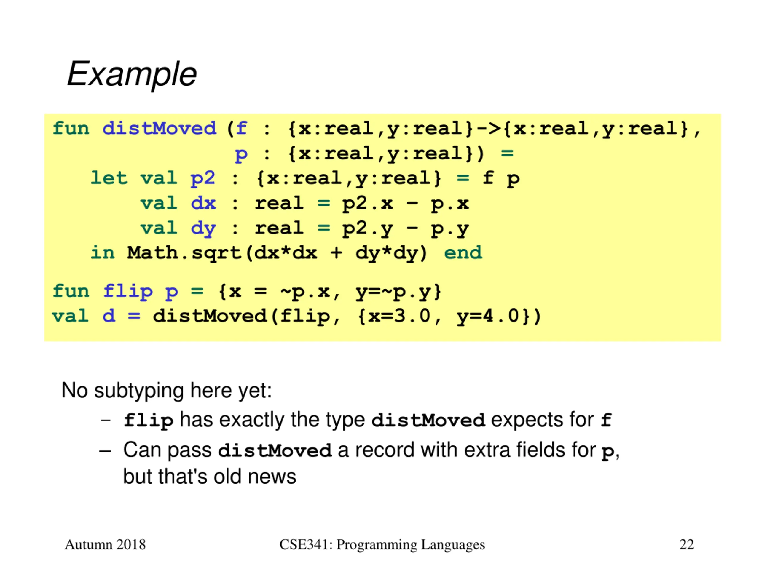 Example fun distMoved(f : {x:real,y:real}->{x:real,y:real}, p : {x:real,y:real}) = let val p2 : {x:real,y:real} = f p val dx : real = p2.x p.x val dy : real = p2.y p.y in Math.sqrt(dx*dx + dy*dy) end fun flip p = {x = ~p.x, y=~p.y} val d = distMoved(flip, {x=3.0, y=4.0}) No subtyping here yet: flip has exactly the type distMoved expects for f Can pass distMoved a record with extra fields for p, but that's old news Autumn 2018 CSE341: Programming Languages 22