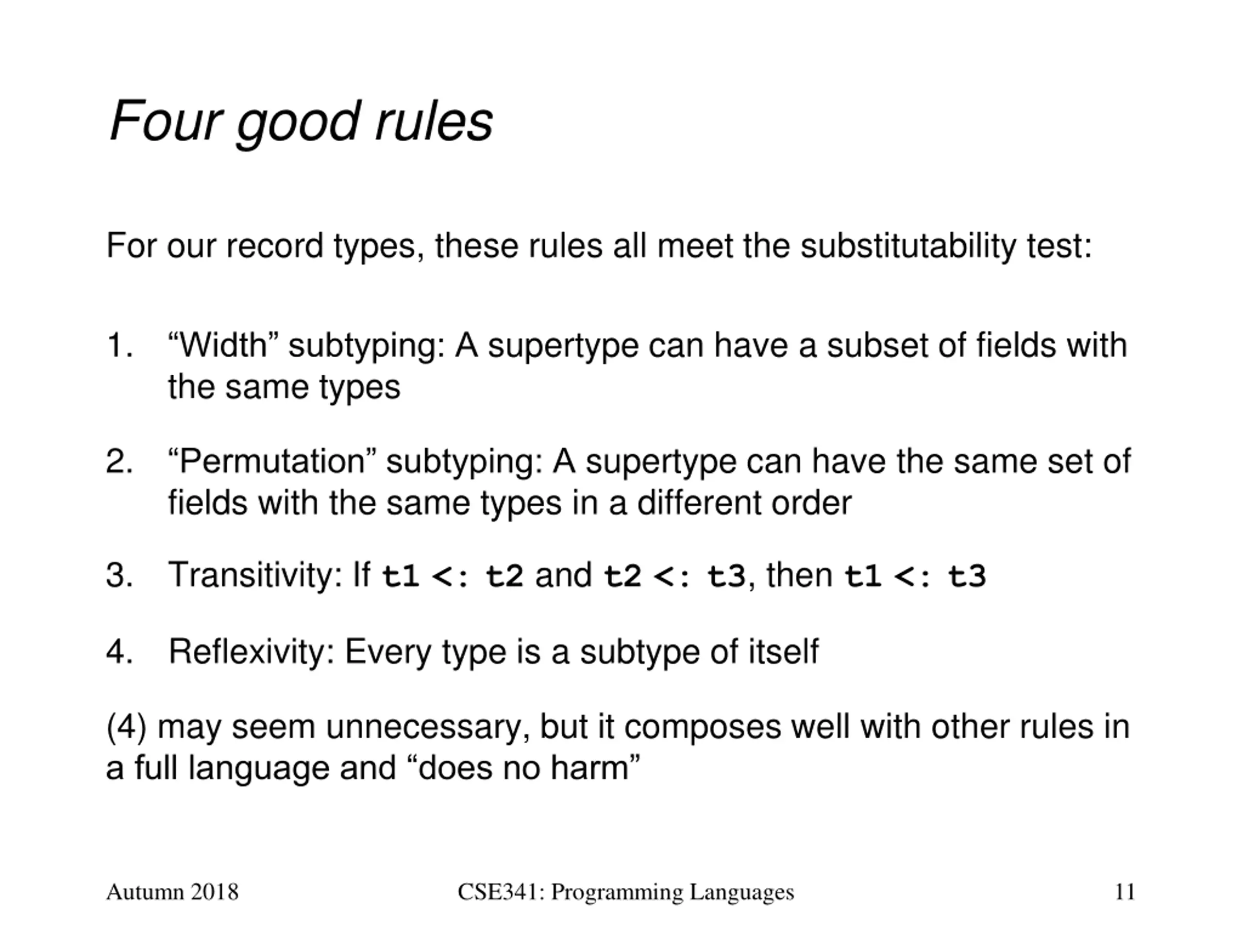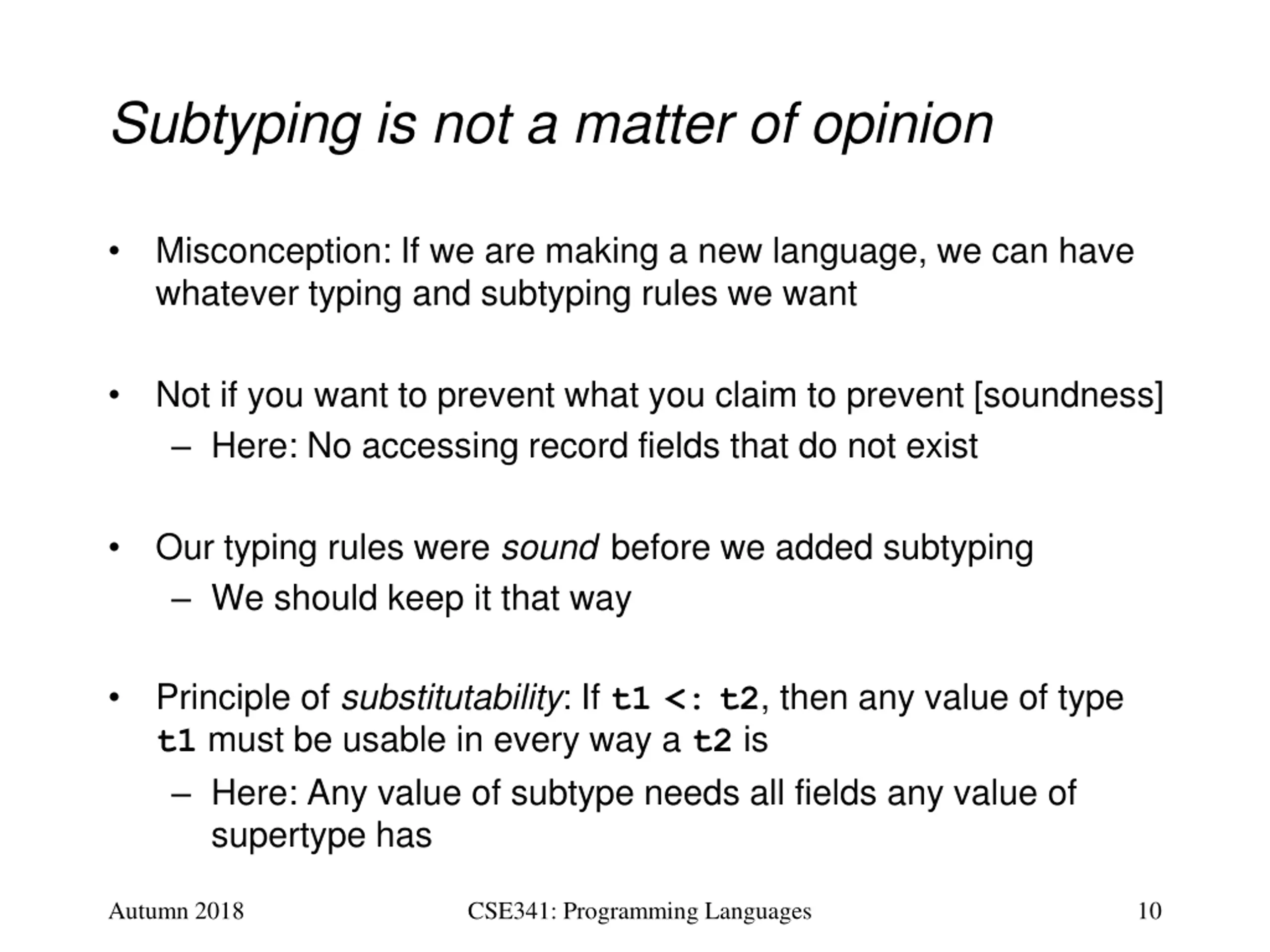 Subtyping is not a matter of opinion Misconception: If we are making a new language, we can have whatever typing and subtyping rules we want Not if you want to prevent what you claim to prevent [soundness] Here: No accessing record fields that do not exist Our typing rules were sound before we added subtyping We should keep it that way Principle of substitutability: If t1<:t2, then any value of type t1 must be usable in every way a t2 is Here: Any value of subtype needs all fields any value of supertype has Autumn 2018 CSE341: Programming Languages 10
