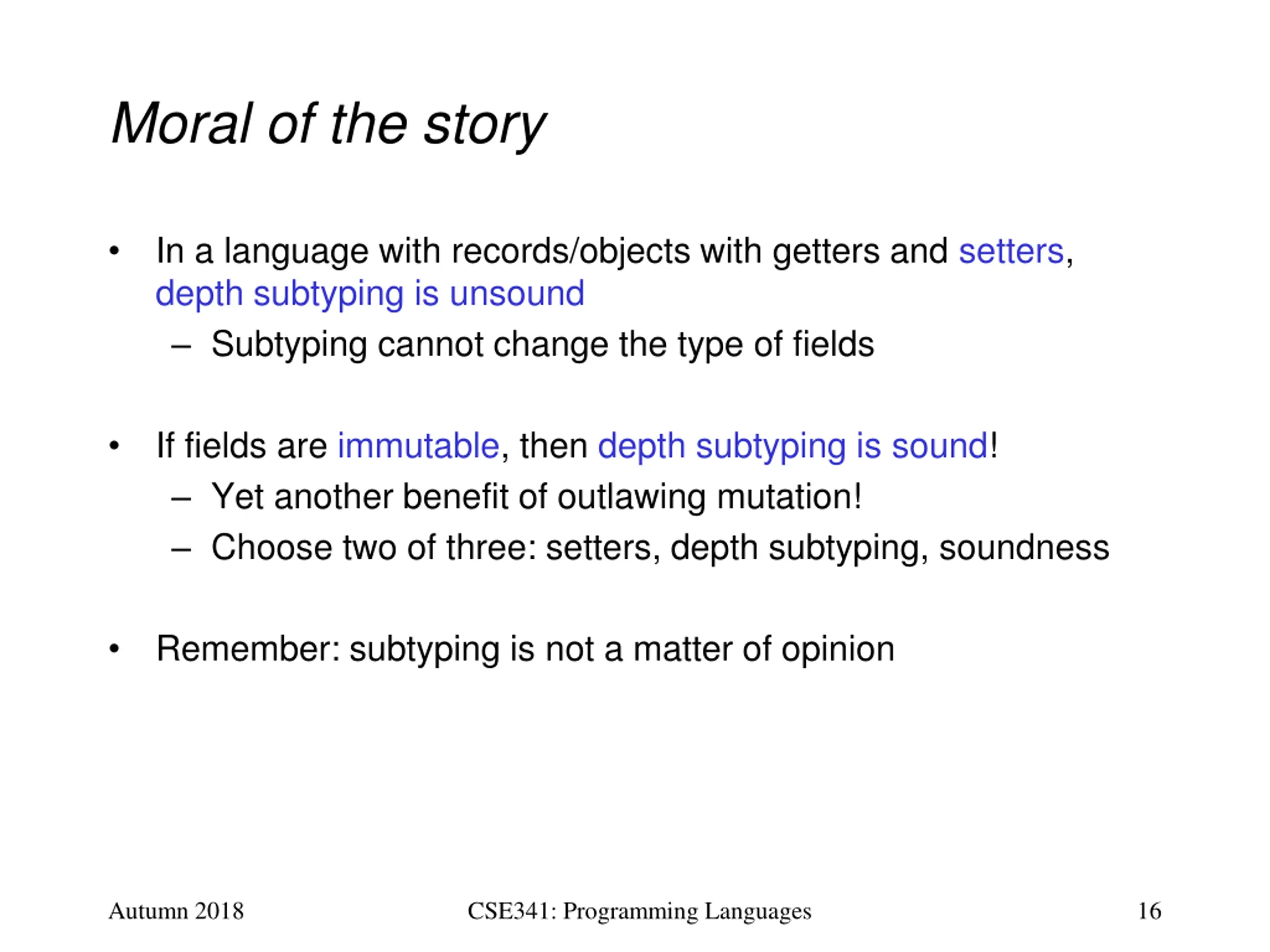 Moral of the story In a language with records/objects with getters and setters, depth subtyping is unsound Subtyping cannot change the type of fields If fields are immutable, then depth subtyping is sound! Yet another benefit of outlawing mutation! Choose two of three: setters, depth subtyping, soundness Remember: subtyping is not a matter of opinion Autumn 2018 CSE341: Programming Languages 16