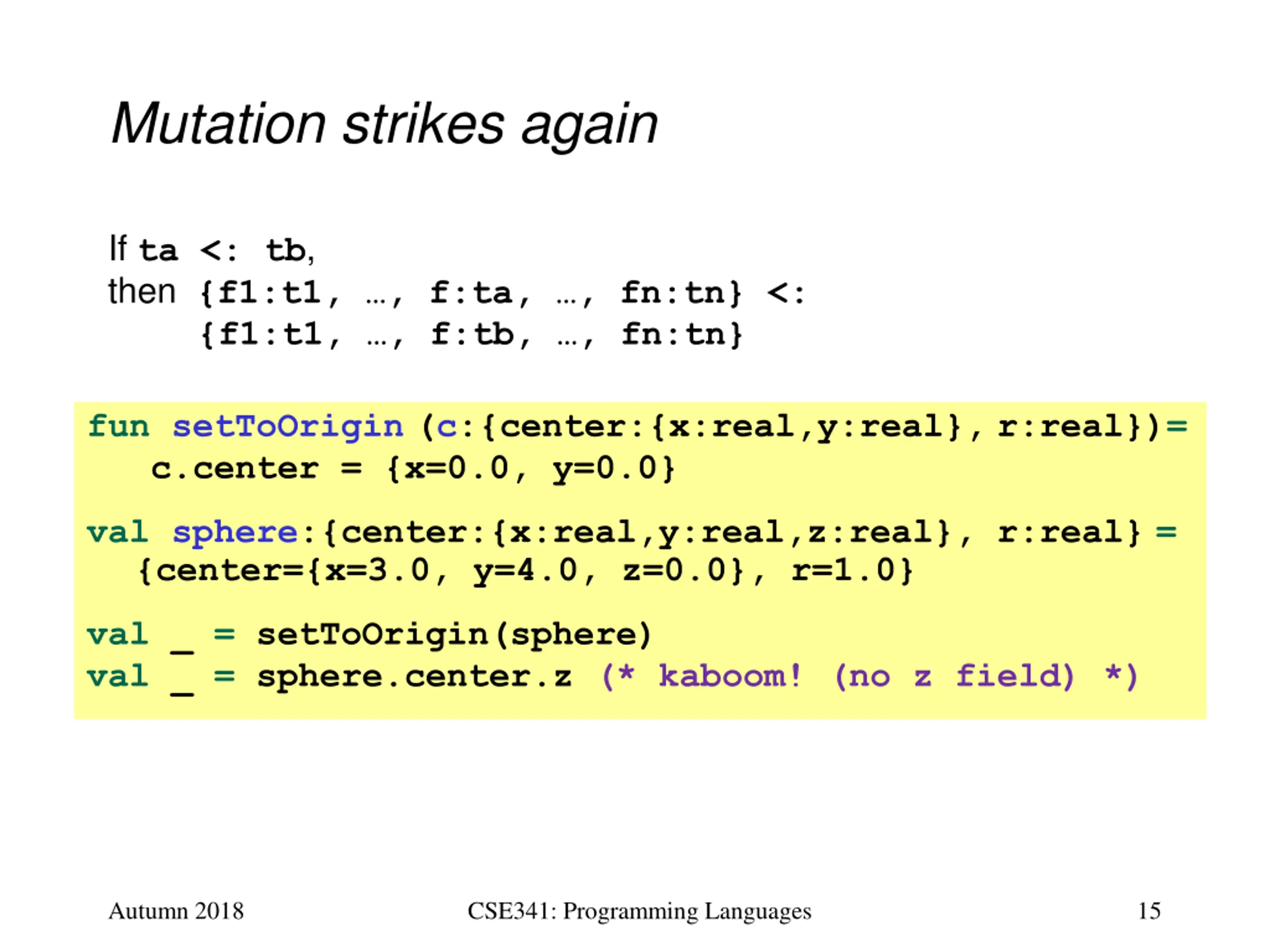 Mutation strikes again If ta <: tb, then {f1:t1, , f:ta, , fn:tn} <: {f1:t1, , f:tb, , fn:tn} fun setToOrigin(c:{center:{x:real,y:real},r:real})= c.center = {x=0.0, y=0.0} val sphere:{center:{x:real,y:real,z:real}, r:real}= {center={x=3.0, y=4.0, z=0.0}, r=1.0} val _ = setToOrigin(sphere) val _ = sphere.center.z (* kaboom! (no z field) *) Autumn 2018 CSE341: Programming Languages 15