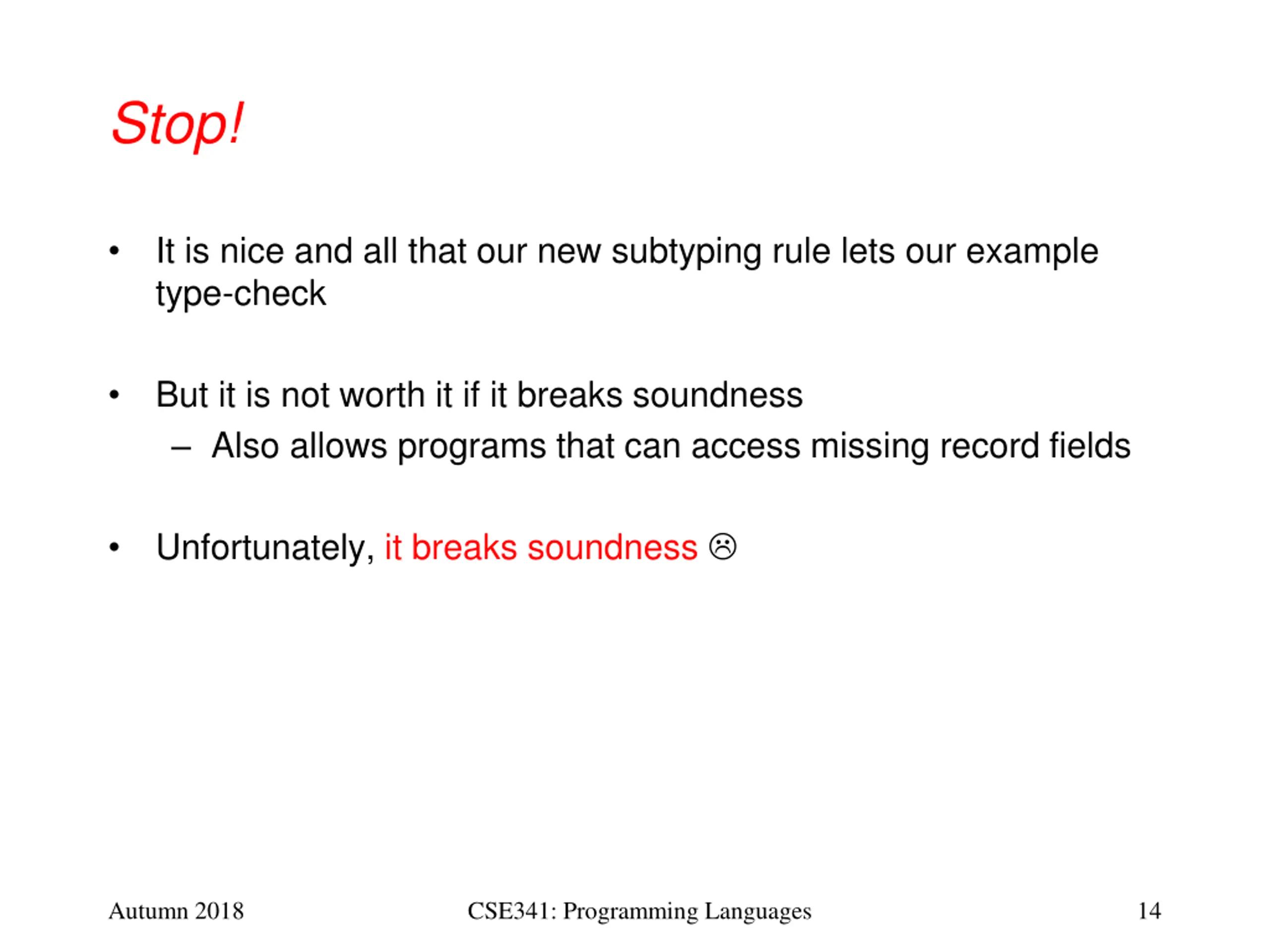 Stop! It is nice and all that our new subtyping rule lets our example type-check But it is not worth it if it breaks soundness Also allows programs that can access missing record fields Unfortunately, it breaks soundness Autumn 2018 CSE341: Programming Languages 14