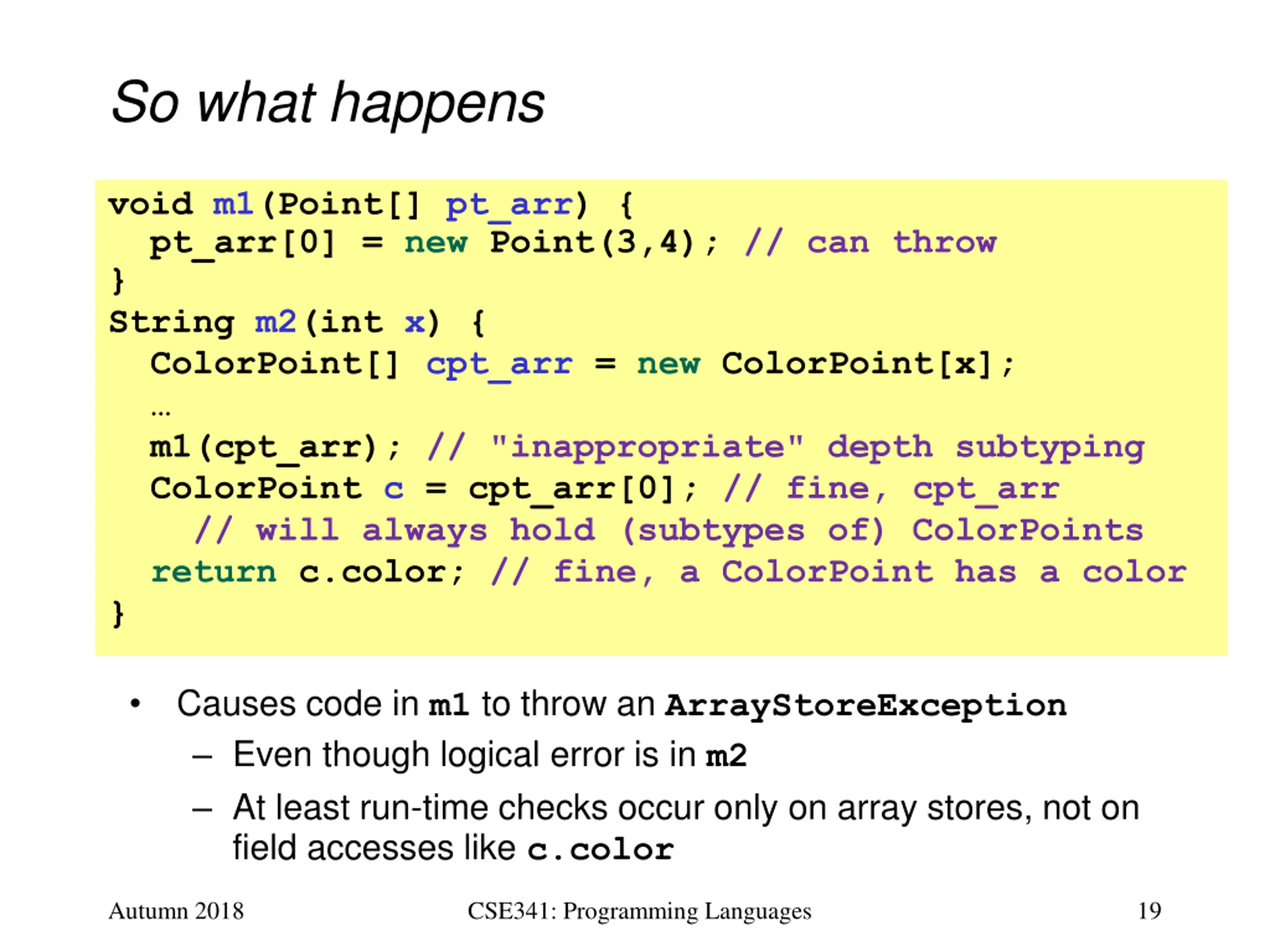 So what happens void m1(Point[] pt_arr) { pt_arr[0] = new Point(3,4); // can throw } String m2(int x) { ColorPoint[] cpt_arr = new ColorPoint[x]; m1(cpt_arr); // "inappropriate" depth subtyping ColorPoint c = cpt_arr[0]; // fine, cpt_arr // will always hold (subtypes of) ColorPoints return c.color; // fine, a ColorPoint has a color } Causes code in m1 to throw an ArrayStoreException Even though logical error is in m2 At least run-time checks occur only on array stores, not on field accesses like c.color Autumn 2018 CSE341: Programming Languages 19