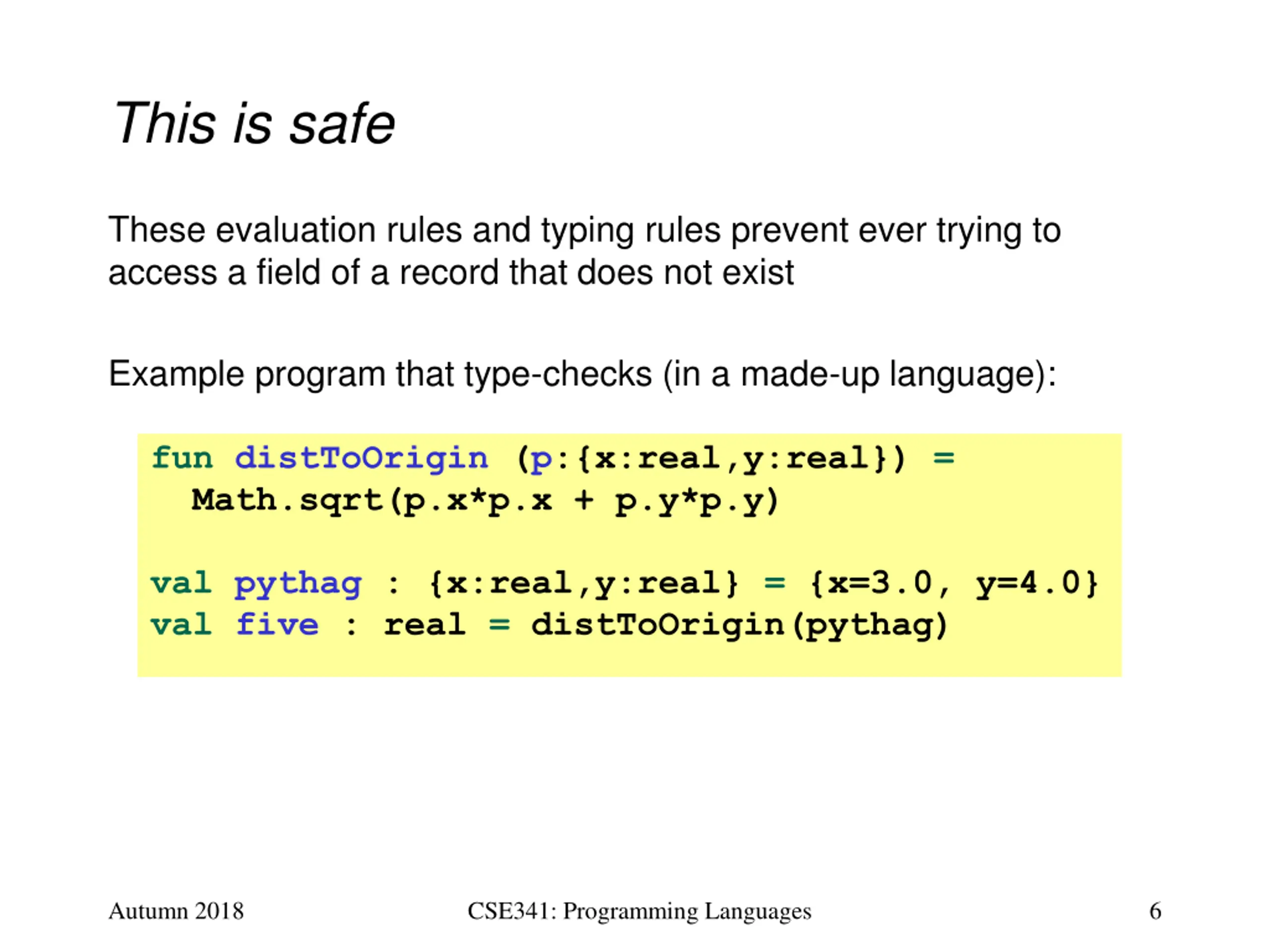 This is safe These evaluation rules and typing rules prevent ever trying to access a field of a record that does not exist Example program that type-checks (in a made-up language): fun distToOrigin (p:{x:real,y:real}) = Math.sqrt(p.x*p.x + p.y*p.y) val pythag : {x:real,y:real} = {x=3.0, y=4.0} val five : real = distToOrigin(pythag) Autumn 2018 CSE341: Programming Languages 6