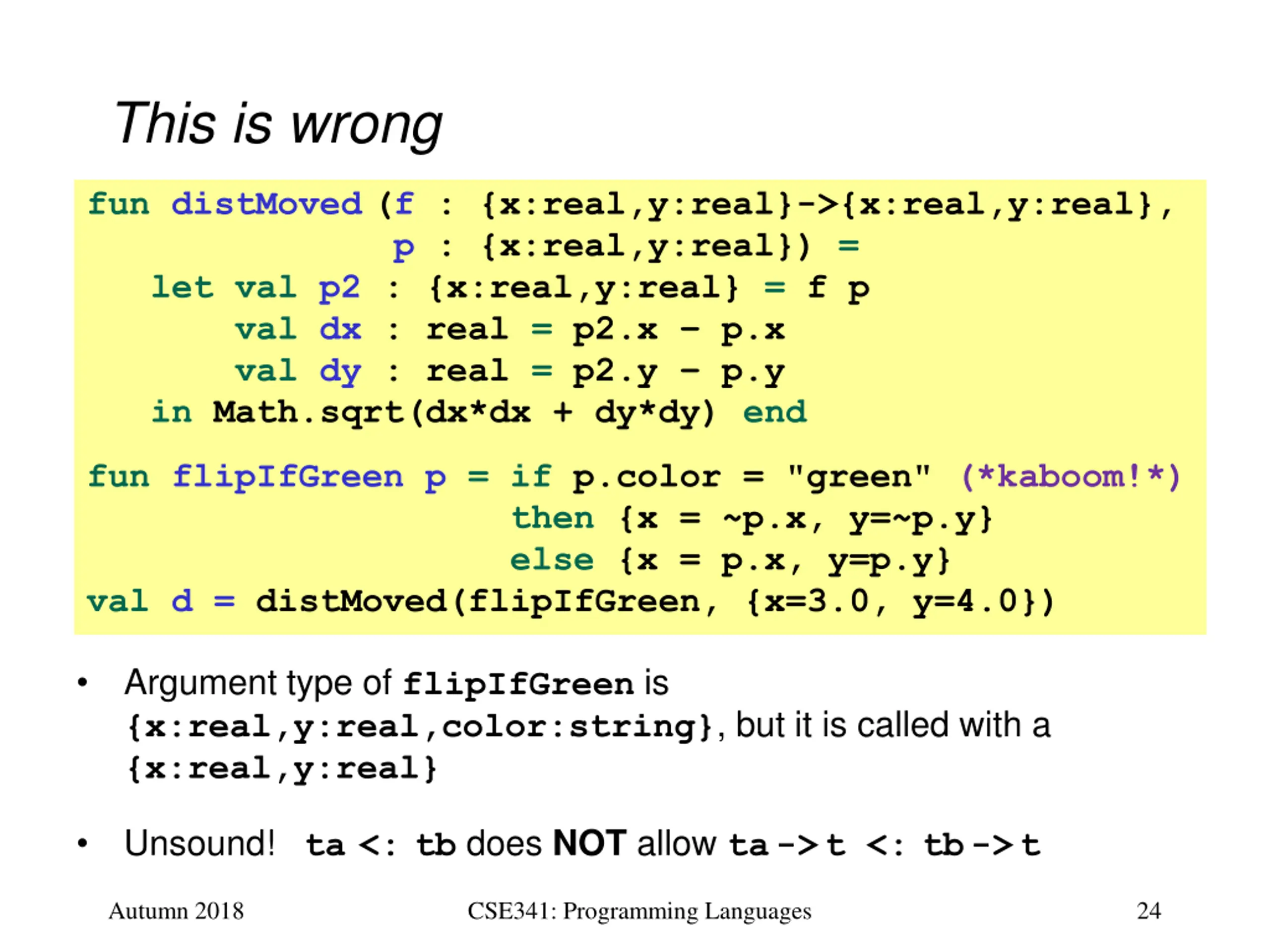This is wrong fun distMoved(f : {x:real,y:real}->{x:real,y:real}, p : {x:real,y:real}) = let val p2 : {x:real,y:real} = f p val dx : real = p2.x p.x val dy : real = p2.y p.y in Math.sqrt(dx*dx + dy*dy) end fun flipIfGreen p = if p.color = "green" (*kaboom!*) then {x = ~p.x, y=~p.y} else {x = p.x, y=p.y} val d = distMoved(flipIfGreen, {x=3.0, y=4.0}) Argument type of flipIfGreen is {x:real,y:real,color:string}, but it is called with a {x:real,y:real} Unsound! ta<:tb does NOT allow ta->t <:tb->t Autumn 2018 CSE341: Programming Languages 24