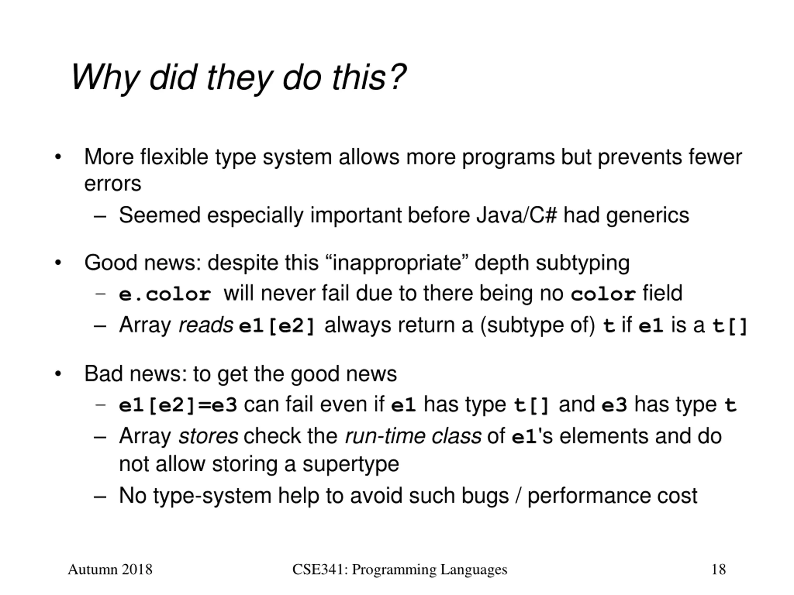 Why did they do this? More flexible type system allows more programs but prevents fewer errors Seemed especially important before Java/C# had generics Good news: despite this inappropriate depth subtyping e.color will never fail due to there being no color field Array readse1[e2] always return a (subtype of) t if e1 is a t[] Bad news: to get the good news e1[e2]=e3 can fail even if e1 has type t[] and e3 has type t Array stores check the run-time class of e1's elements and do not allow storing a supertype No type-system help to avoid such bugs / performance cost Autumn 2018 CSE341: Programming Languages 18