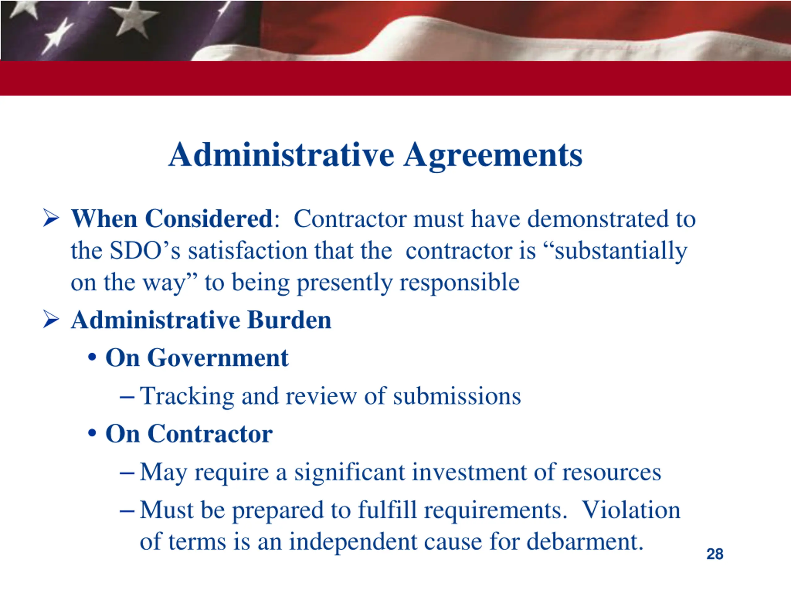 Administrative Agreements When Considered: Contractor must have demonstrated to the SDO s satisfaction that the contractor is substantially on the way to being presently responsible Administrative Burden On Government Tracking and review of submissions On Contractor May require a significant investment of resources Must be prepared to fulfill requirements. Violation of terms is an independent cause for debarment. 28