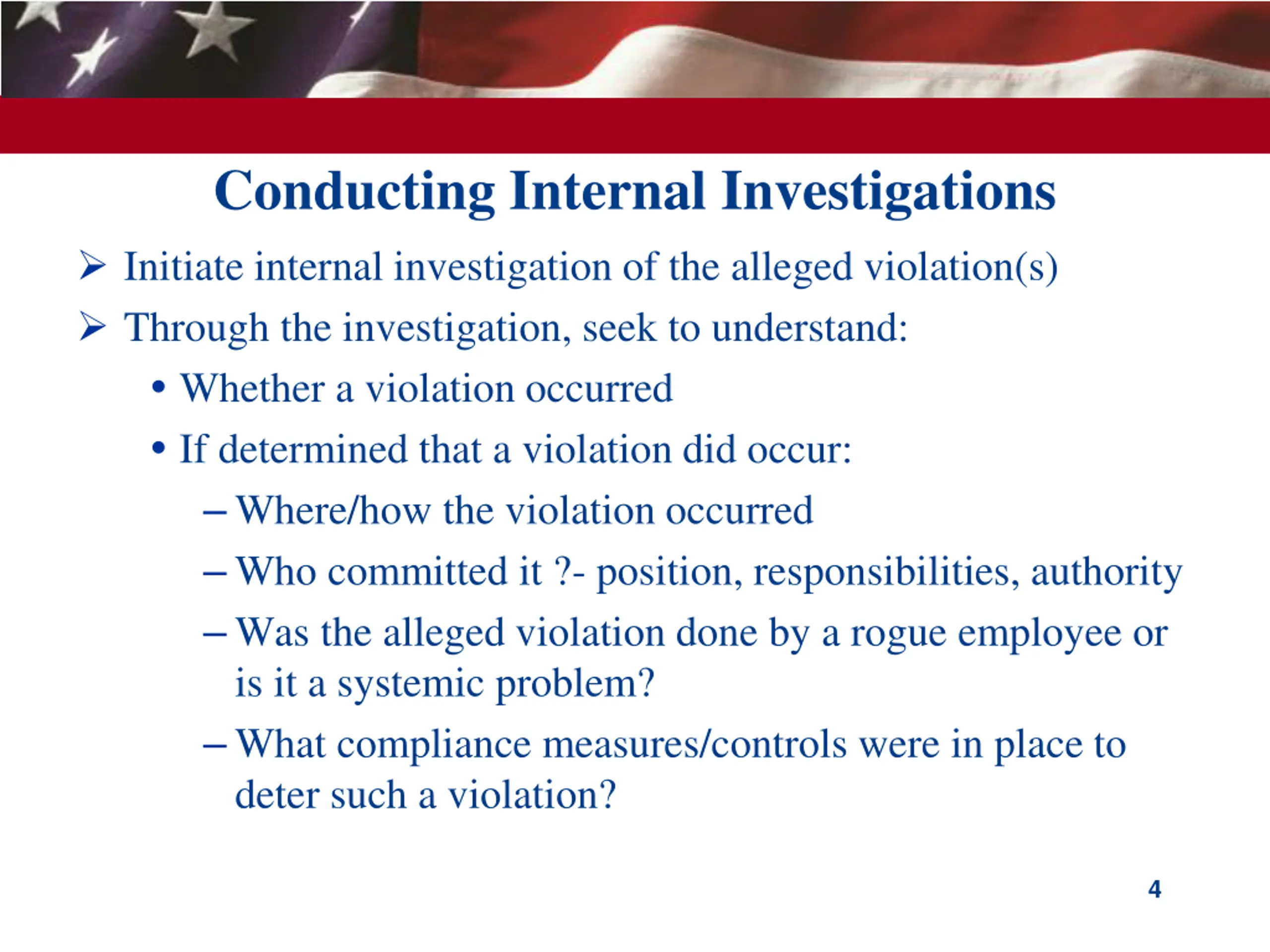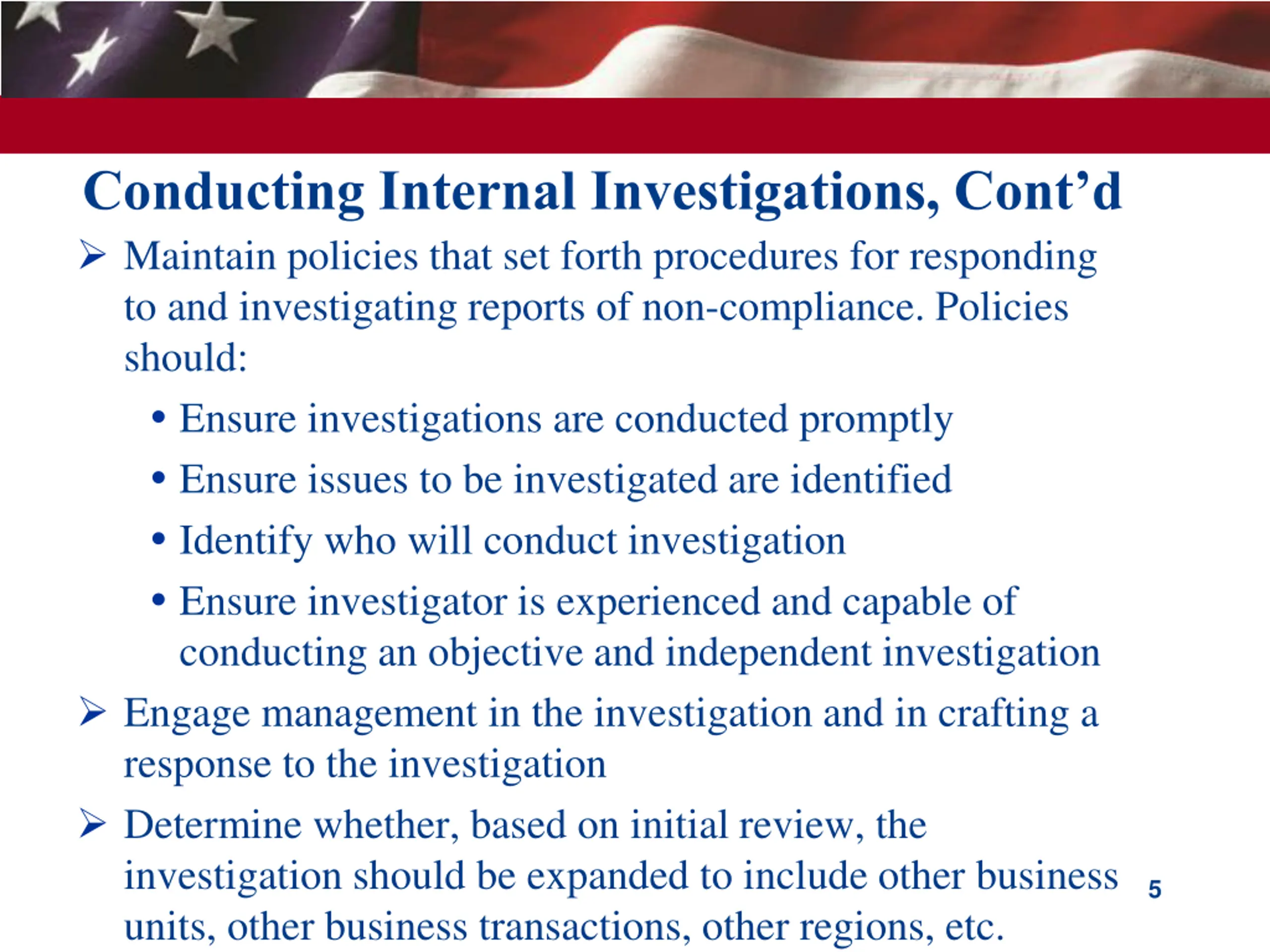 Conducting Internal Investigations Initiate internal investigation of the alleged violation(s) Through the investigation, seek to understand: Whether a violation occurred If determined that a violation did occur: Where/how the violation occurred Who committed it ?- position, responsibilities, authority Was the alleged violation done by a rogue employee or is it a systemic problem? What compliance measures/controls were in place to deter such a violation? 4