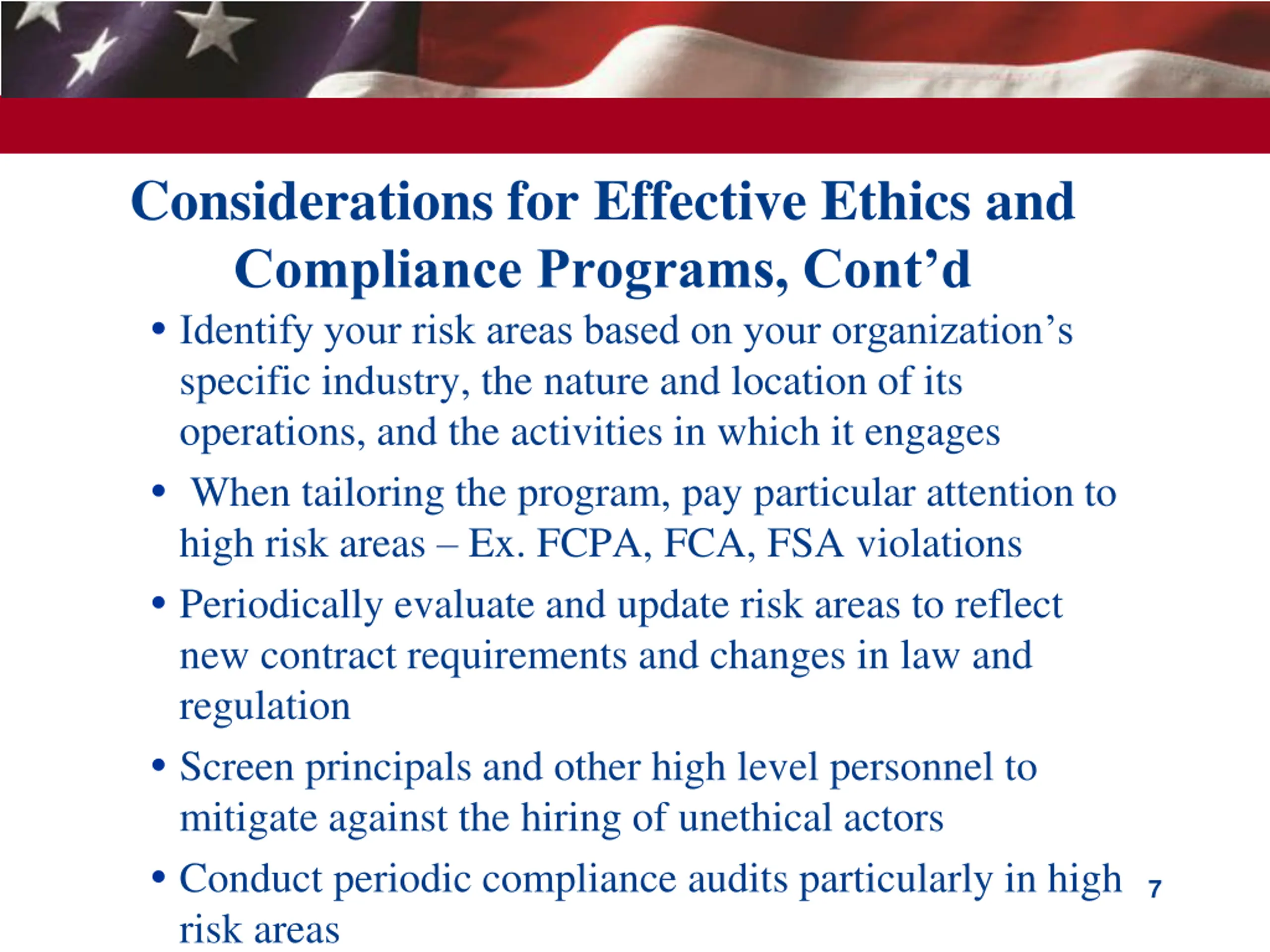 Considerations for Effective Ethics and Compliance Programs For Ethics Programs: Select values that are tailored to your business or risk profile Define and communicate values in a manner that makes sense to employees Ensure leadership engagement in promotion of values For Compliance Programs: Review and improve ethics and compliance training, policies, internal controls, practices and strengthen in light of investigation findings, lessons learned 6