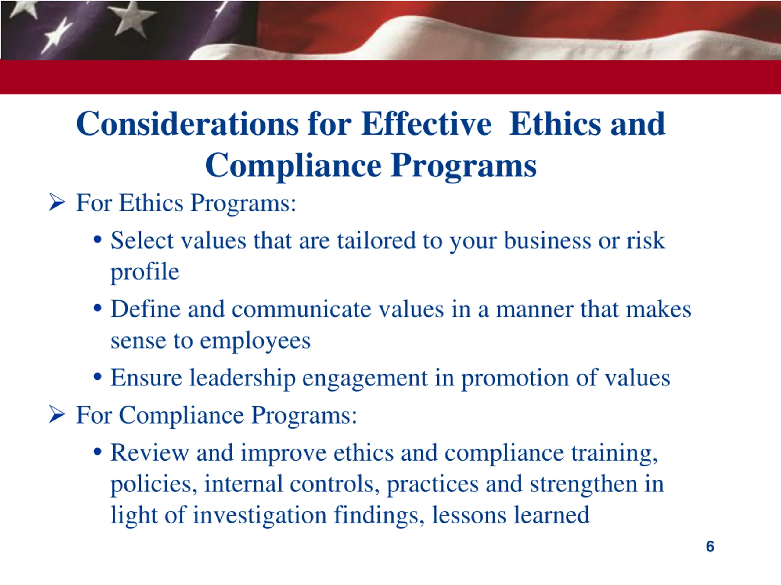 Conducting Internal Investigations, Contd Maintain policies that set forth procedures for responding to and investigating reports of non-compliance. Policies should: Ensure investigations are conducted promptly Ensure issues to be investigated are identified Identify who will conduct investigation Ensure investigator is experienced and capable of conducting an objective and independent investigation Engage management in the investigation and in crafting a response to the investigation Determine whether, based on initial review, the investigation should be expanded to include other business units, other business transactions, other regions, etc. 5