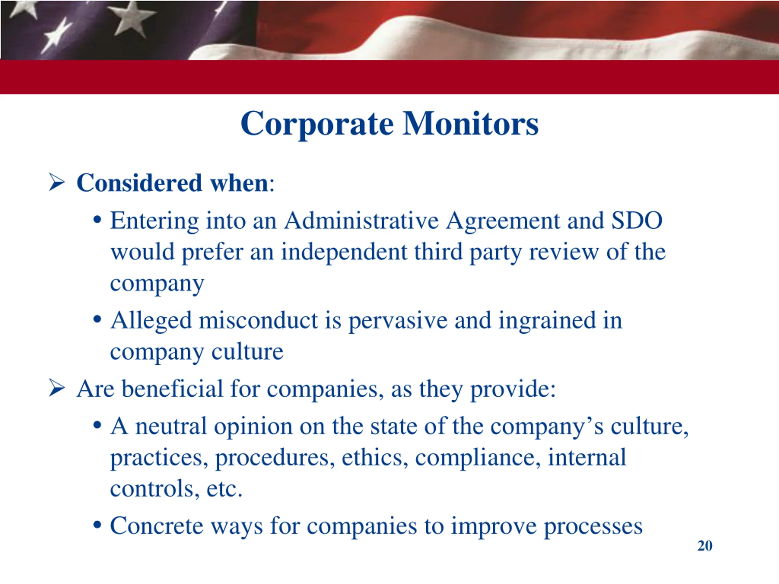 Corporate Monitors Considered when: Entering into an Administrative Agreement and SDO would prefer an independent third party review of the company Alleged misconduct is pervasive and ingrained in company culture Are beneficial for companies, as they provide: A neutral opinion on the state of the company s culture, practices, procedures, ethics, compliance, internal controls, etc. Concrete ways for companies to improve processes 20