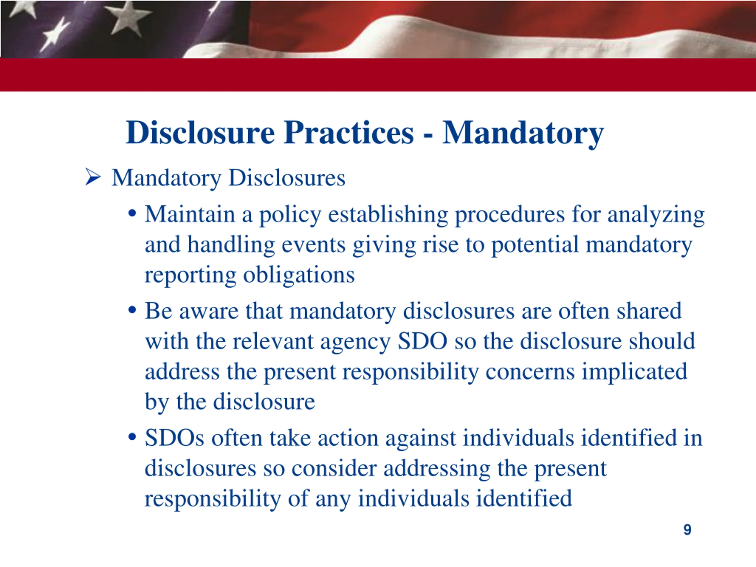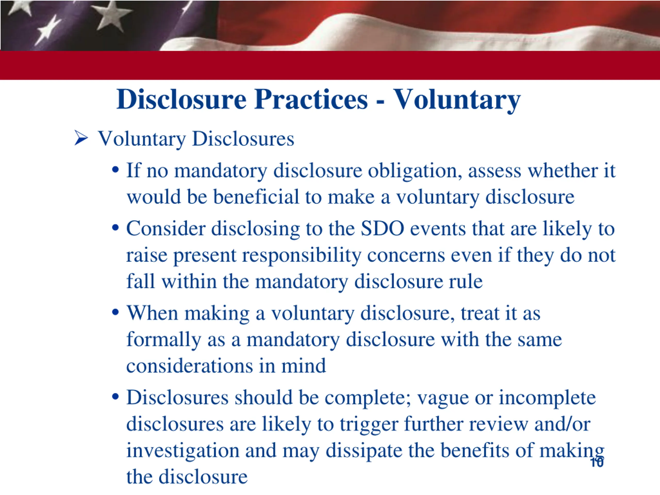 Disclosure Practices - Mandatory Mandatory Disclosures Maintain a policy establishing procedures for analyzing and handling events giving rise to potential mandatory reporting obligations Be aware that mandatory disclosures are often shared with the relevant agency SDO so the disclosure should address the present responsibility concerns implicated by the disclosure SDOs often take action against individuals identified in disclosures so consider addressing the present responsibility of any individuals identified 9