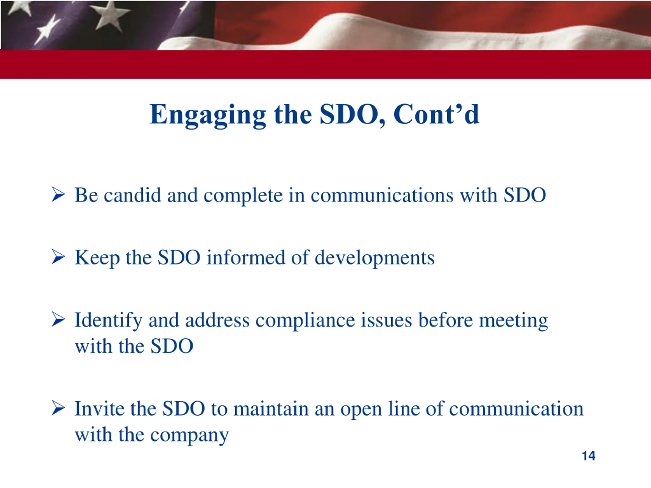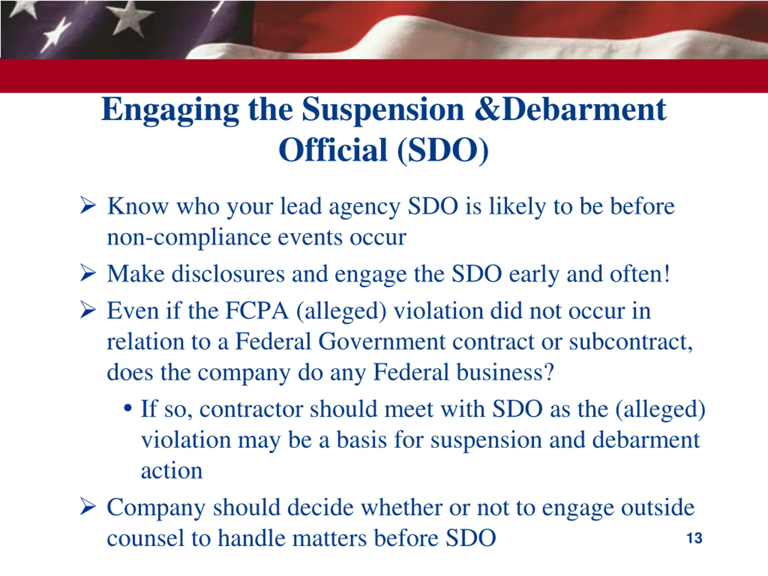Engaging the Suspension &Debarment Official (SDO) Know who your lead agency SDO is likely to be before non-compliance events occur Make disclosures and engage the SDO early and often! Even if the FCPA (alleged) violation did not occur in relation to a Federal Government contract or subcontract, does the company do any Federal business? If so, contractor should meet with SDO as the (alleged) violation may be a basis for suspension and debarment action Company should decide whether or not to engage outside counsel to handle matters before SDO 13